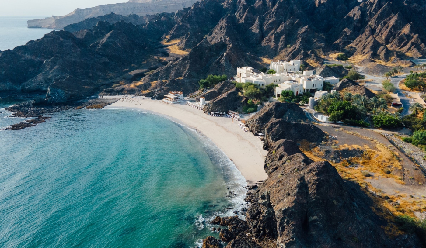 Set between the mountains and the Gulf of Oman, its private beach is long, quiet and well protected.