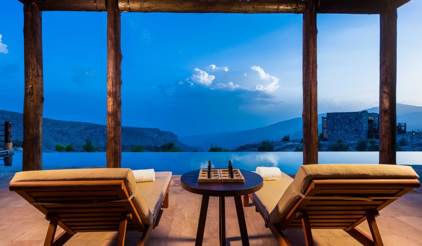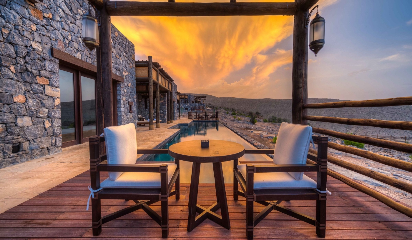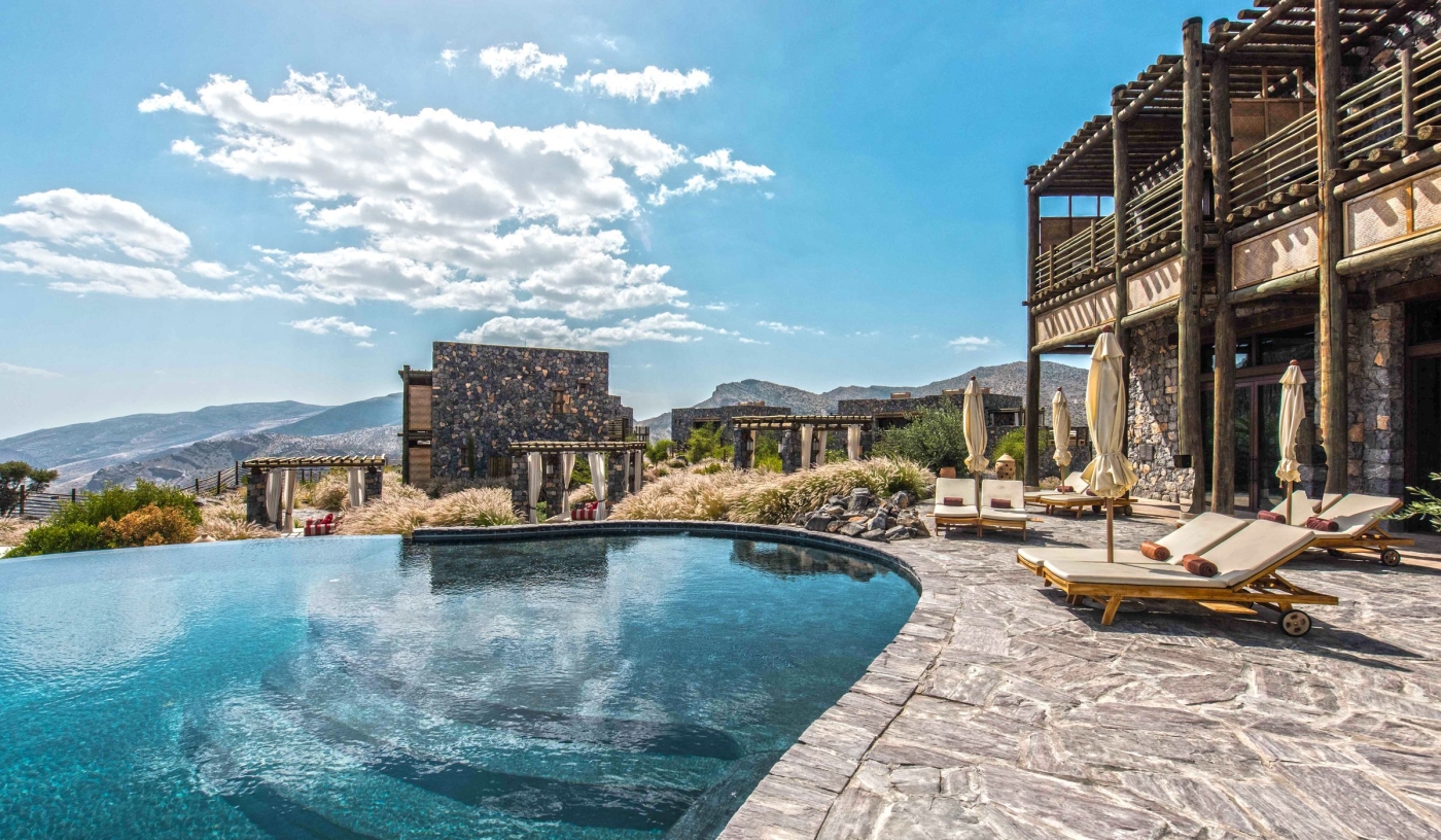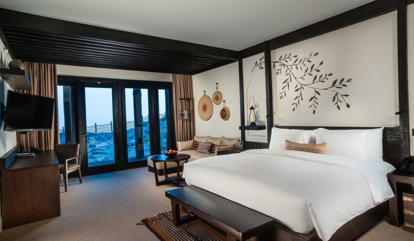 Eighty-six suites and villas feature king-size beds, Omani chests, walls hand-painted with juniper-tree motifs and private balconies facing the horizon, ridge or mountains