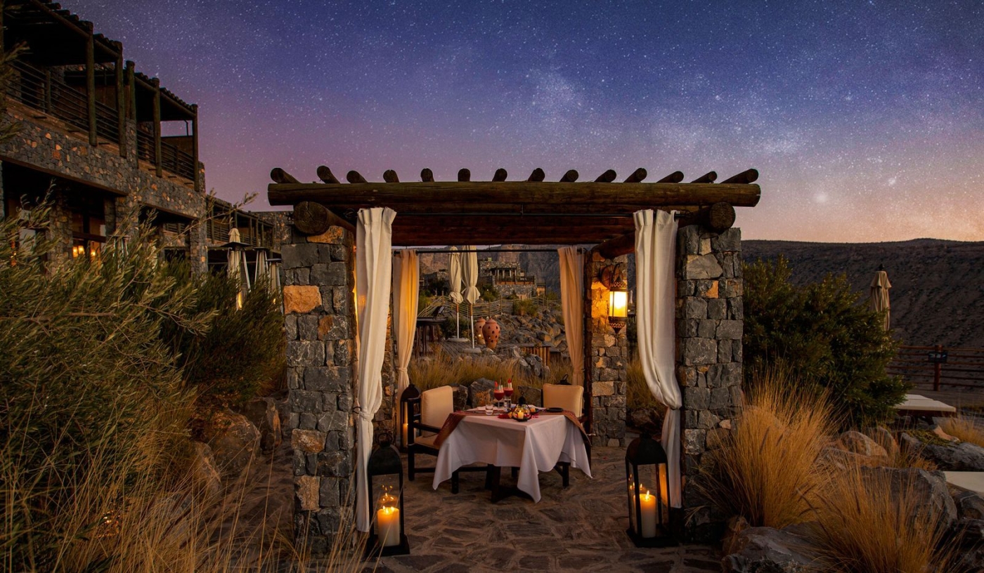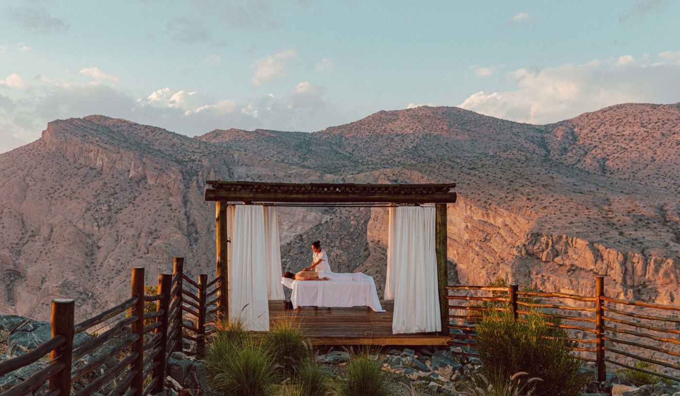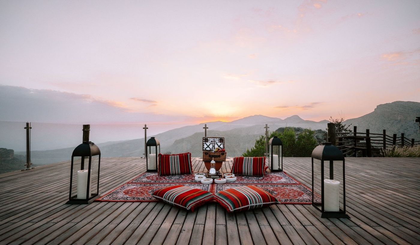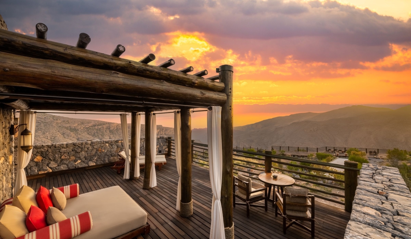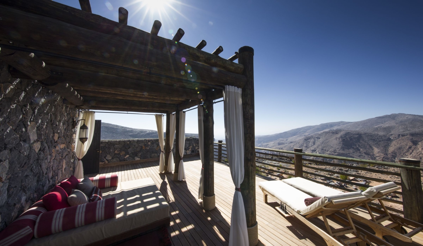 Eighty-six suites and villas feature king-size beds, Omani chests, walls hand-painted with juniper-tree motifs and private balconies facing the horizon, ridge or mountains