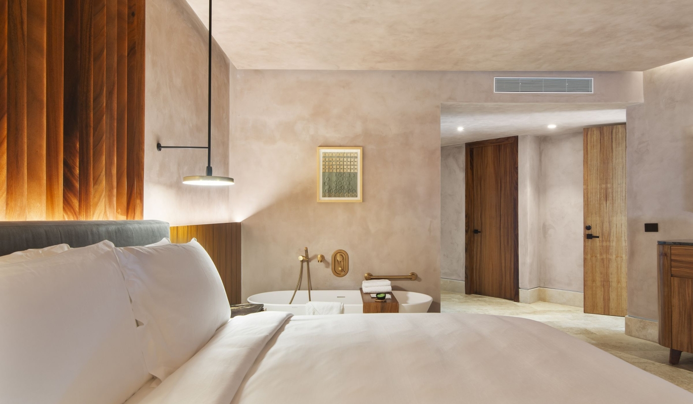 Every suite features floor-to-ceiling windows, an ocean-facing balcony and neutral interiors finished with natural materials