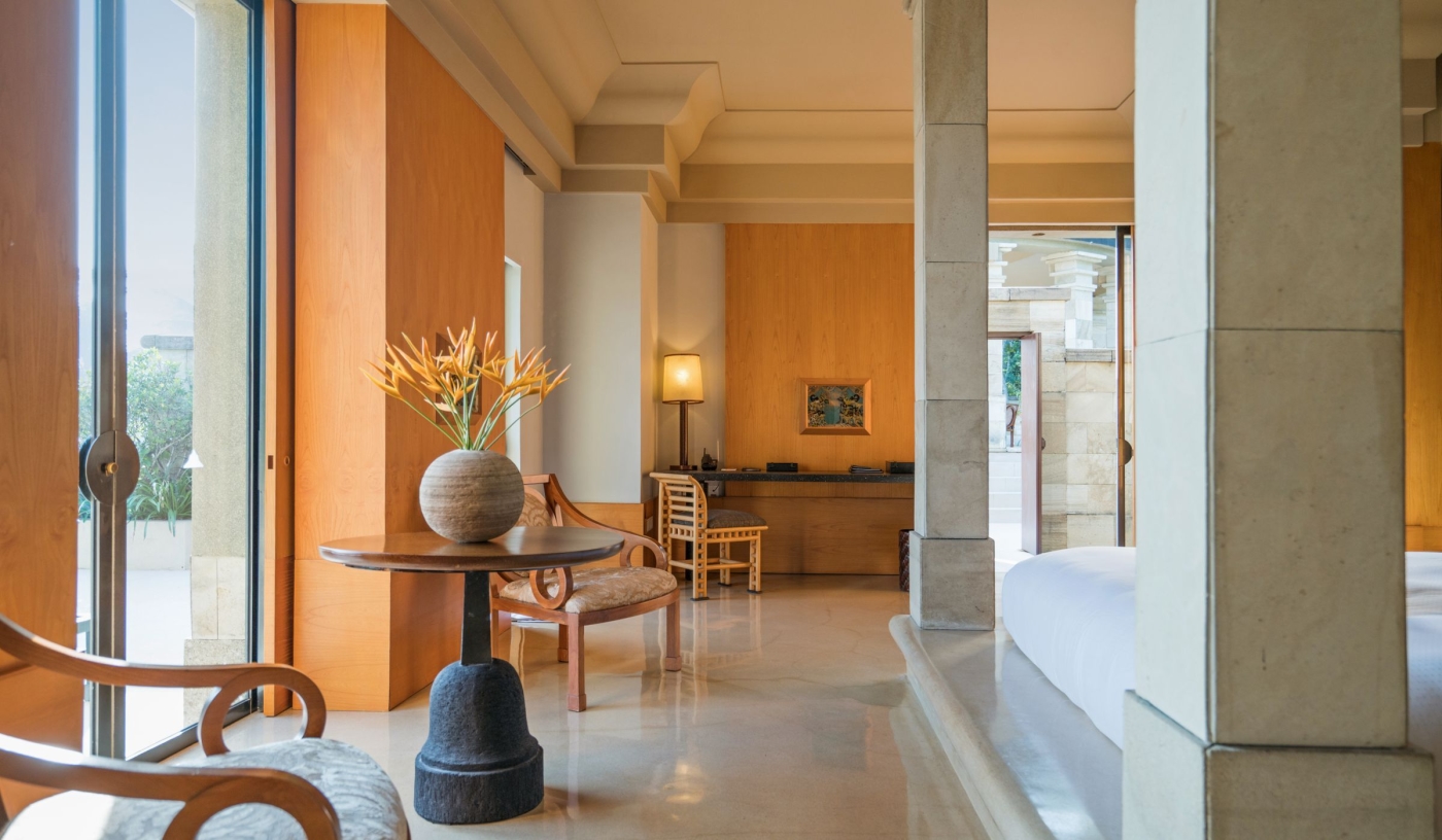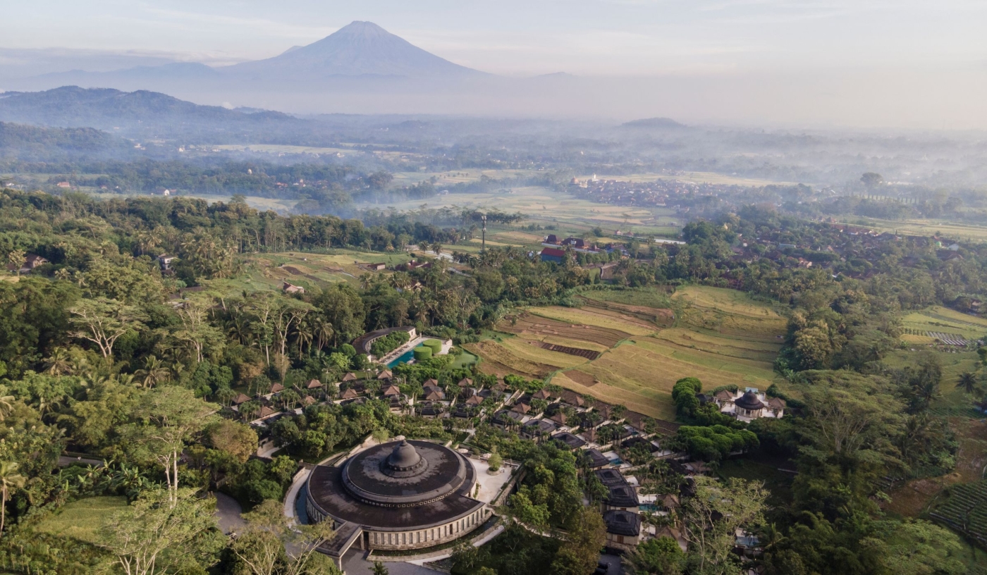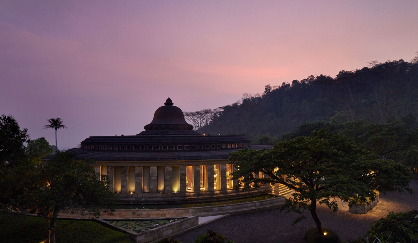 Stone walkways connect crescent-arranged suites, reflecting the design of Borobudur itself
