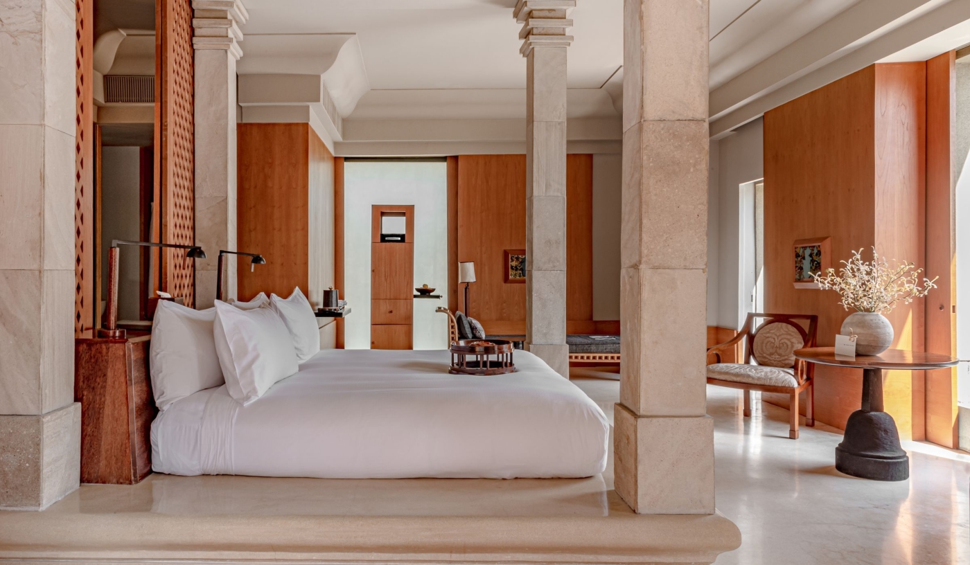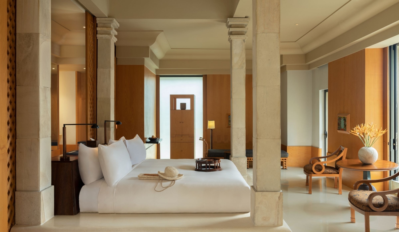 Suites feature four-poster beds, rattan furniture, outdoor soaking tubs, and day beds in thatched pavilions