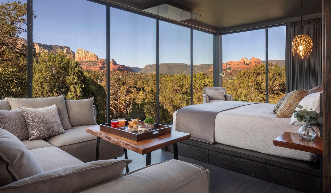 Set across three acres of rugged Red Rock Country in Sedona, Arizona, this family-owned, adults-only resort features 40 cubed cabins or ‘atriums’, all detached and private with floor-to-ceiling glass walls and a rooftop deck complete with daybed and firepit.