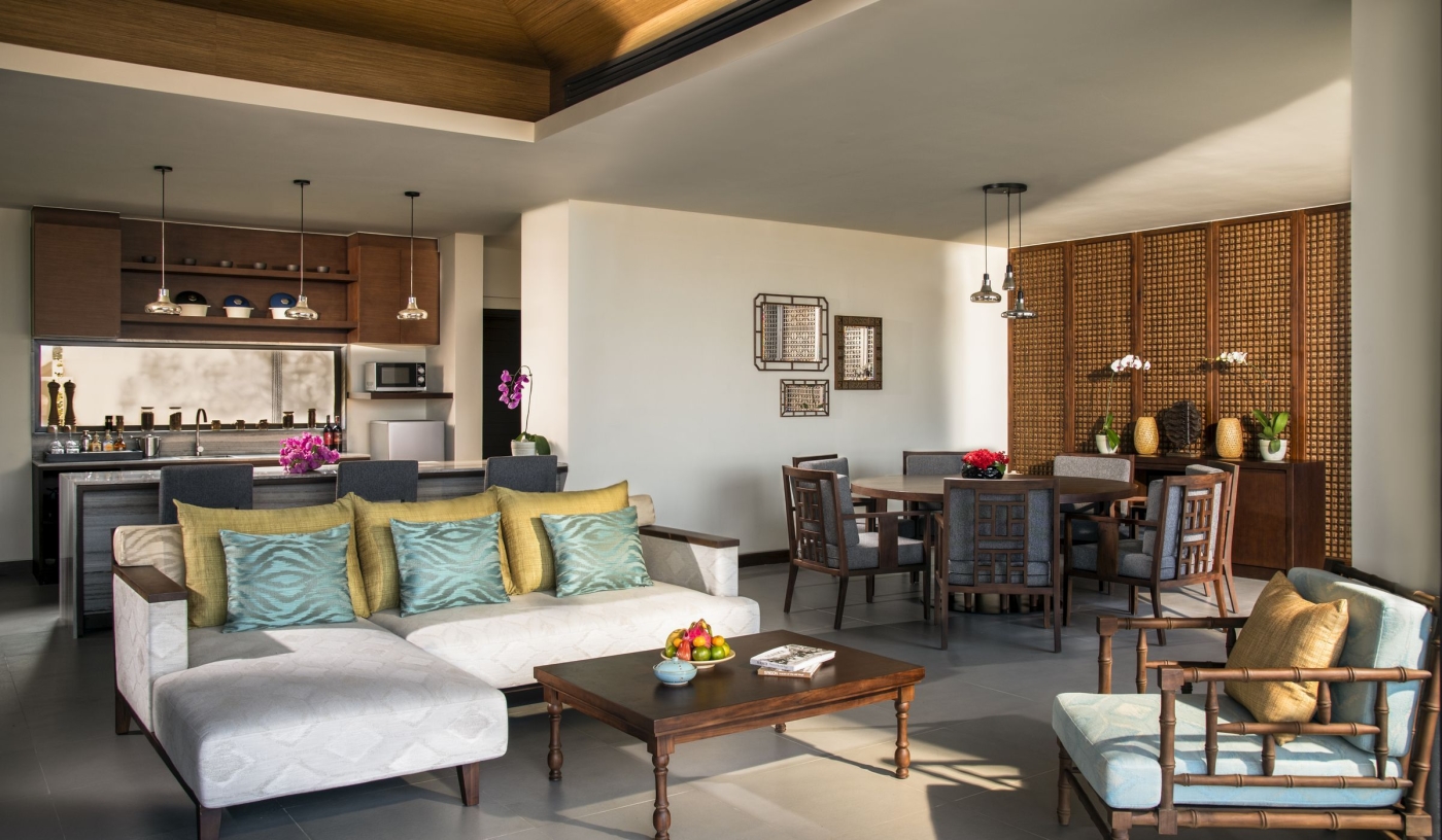 Villas offer private beachfront or hillside stays with floor-to-ceiling windows, open-air showers, sun decks, and private pools with panoramic ocean views