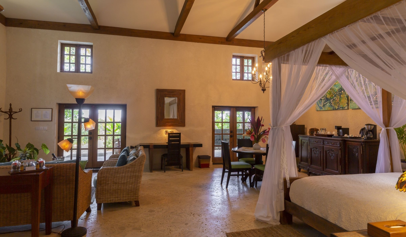 No two rooms are the same: one may be built around a tree, in another the red blossom winds around a balcony, while some are open-sided to make the most of the Piton views