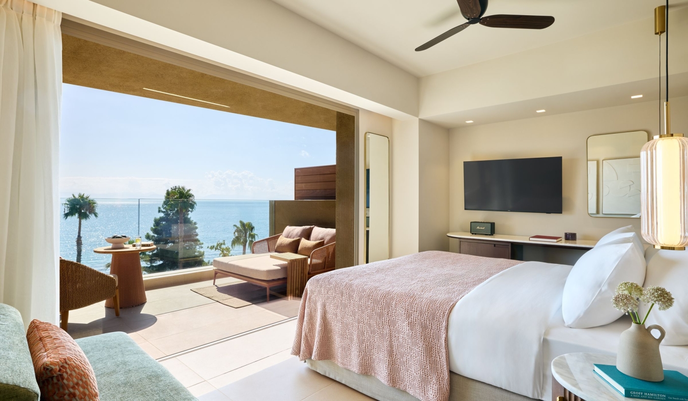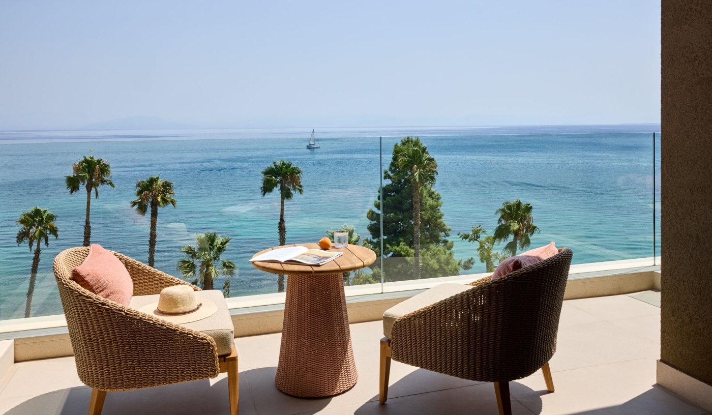 Set on an idyllic, lush green hilltop overlooking picturesque Benitses Bay, with seemingly endless sea views, it’s hard not to be impressed by the elevated style and contemporary heights of this lavish spa and beach resort.