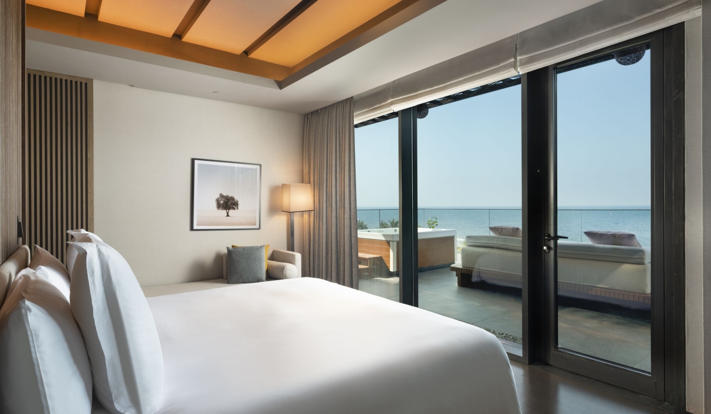Modern rooms and suites feature soft palettes of earthy greys and deep creams, pillow menus, private balconies and luxurious Banyan Tree amenities