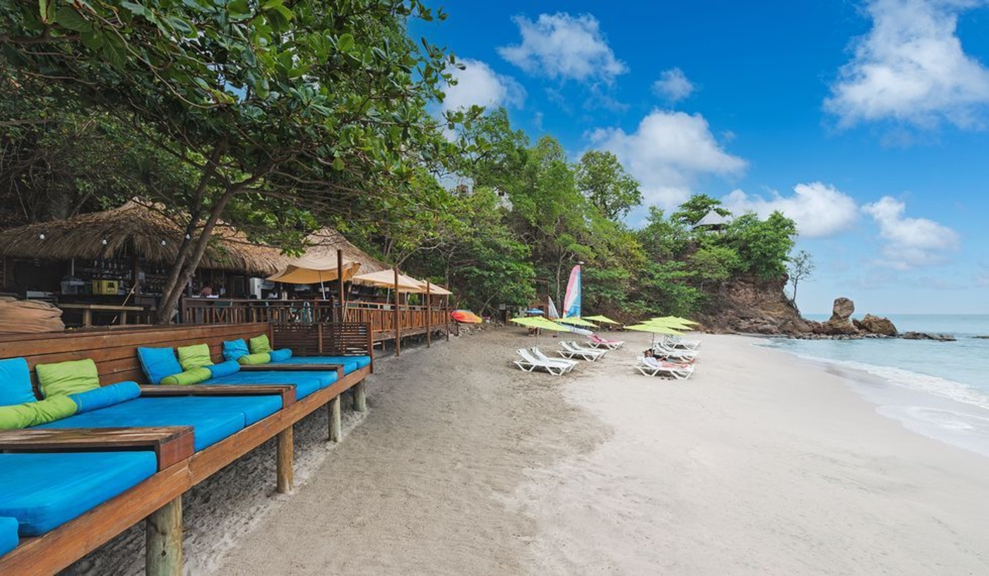 Guests meander past pretty courtyards to reach the striking pools, one with views of Martinique, before descending to the beach where kayaks and Hobie Cats await