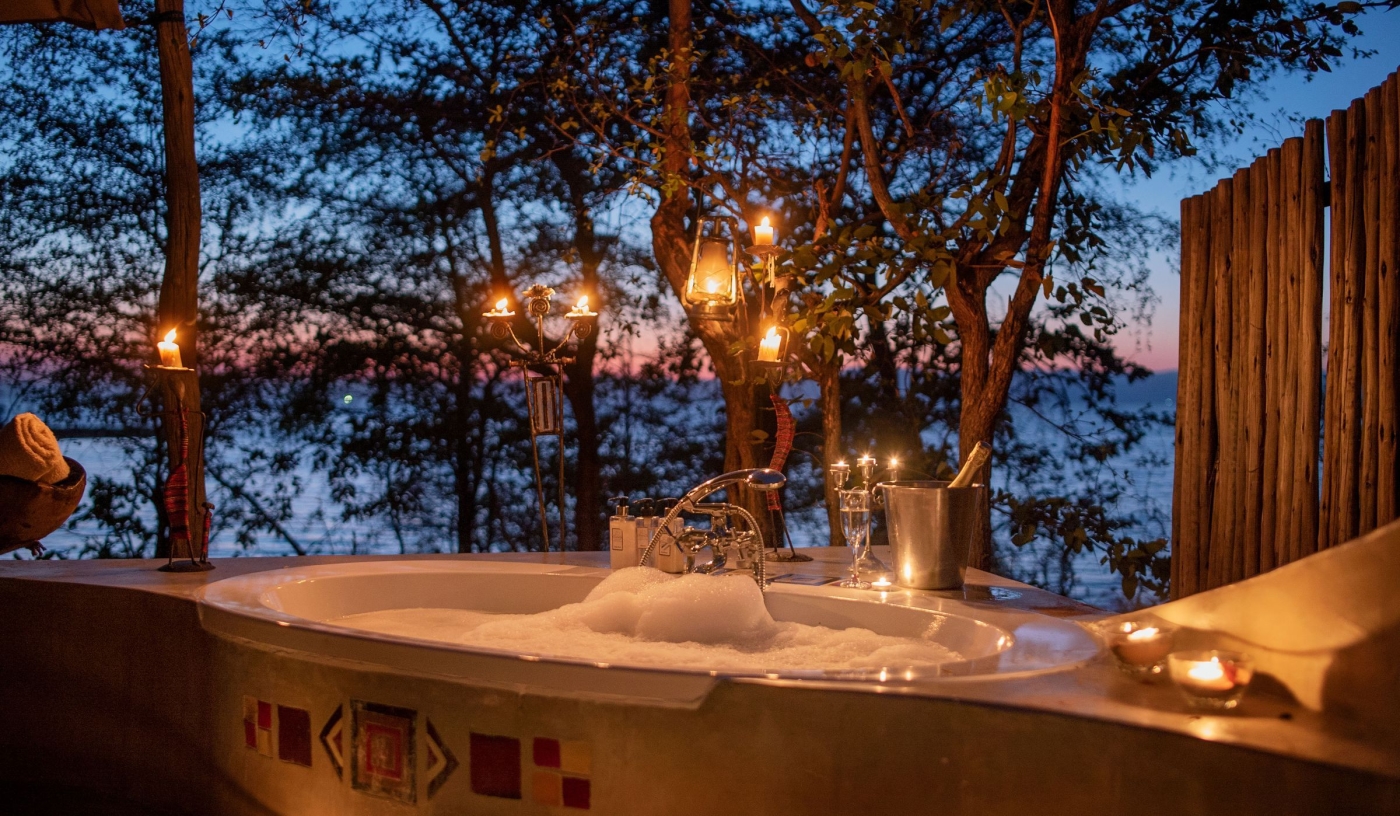 Romantic outdoor bathtub and shower with spectacular views over Lake Kariba