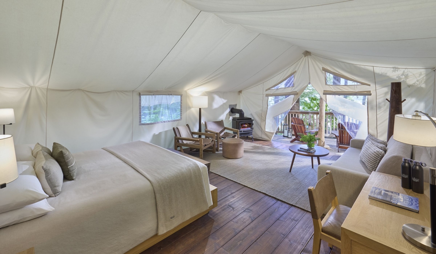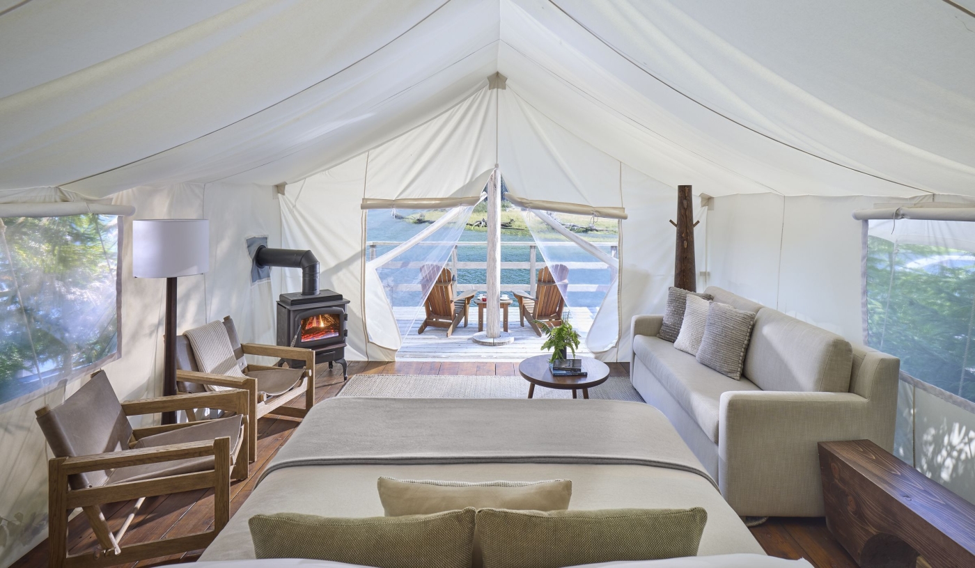Twenty-five luxury canvas tents echo the spirit of old-world exploration, with wood stoves, heated floors and stunning views.