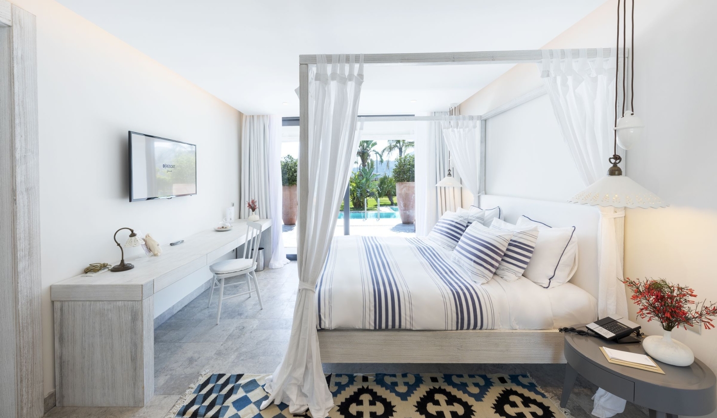 Light-filled rooms in nautical style, with ground-floor options by the pool and chic suites offering extra space to unwind.