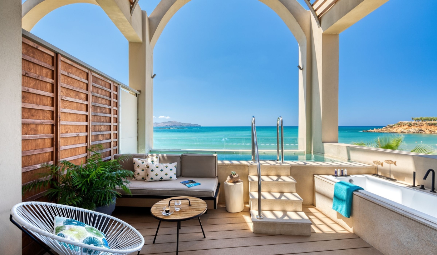Rooms range from sea-facing suites to poolside options, many with plunge pools, jacuzzis, hammocks or private terraces.