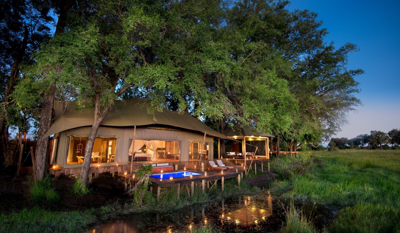 The remote northern region of the Okavango Delta is the setting for this luxury tented camp, set among a matrix of palm-dotted islands, flood plains and woodland.