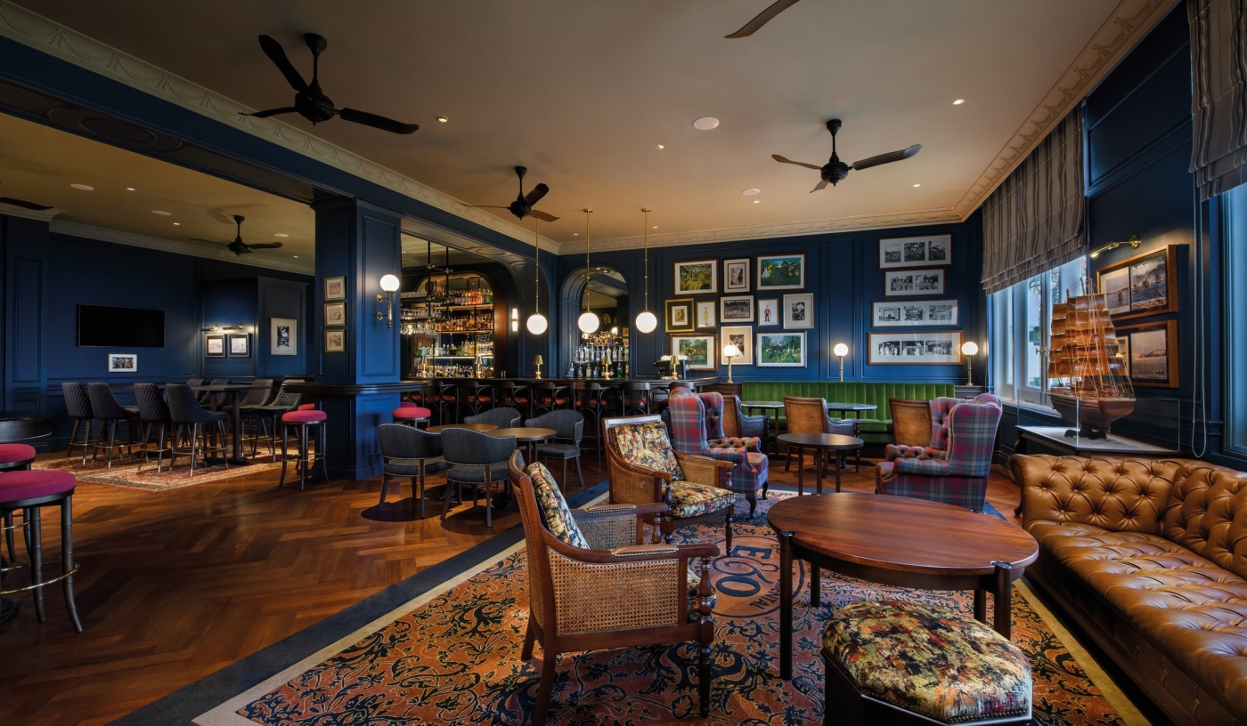 Farquhar's Bar exudes a timeless British feel, a classic long bar for a cocktail or a pint on the Penang waterfront