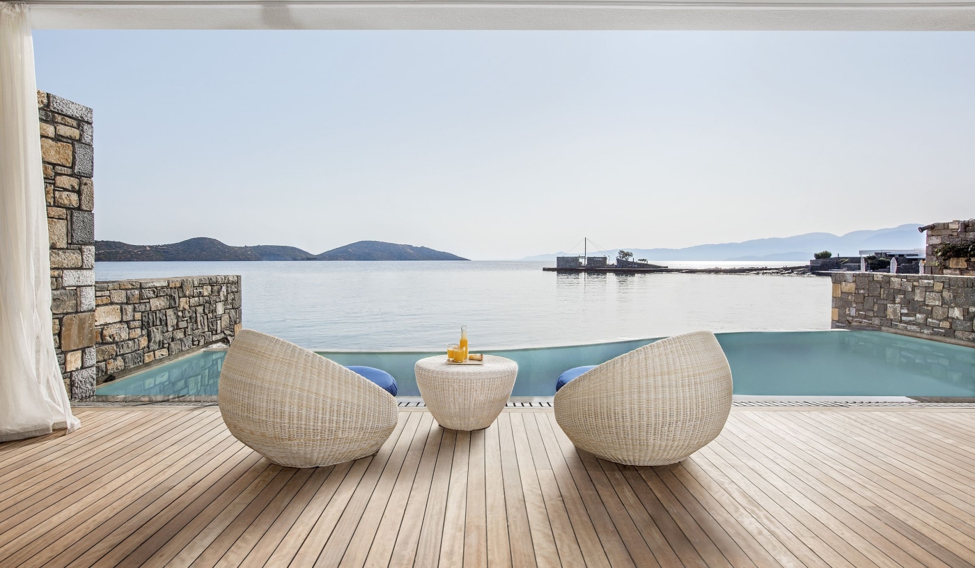 This contemporary design hotel offers sweeping views across Elounda’s Mirabello Bay to the island of Spinalonga. Among the rooms and suites, all have private pools with sunbeds and outdoor showers, and because the whole resort is staggered up a hillside, every room boasts exceptional sea views.