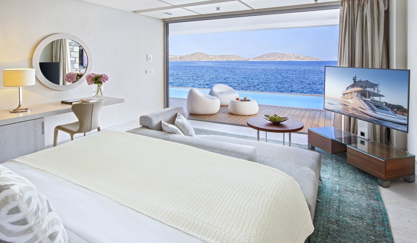 The Elounda Beach Penthouse Spa offers tailored treatments, while daily fitness sessions range from tennis to volleyball.