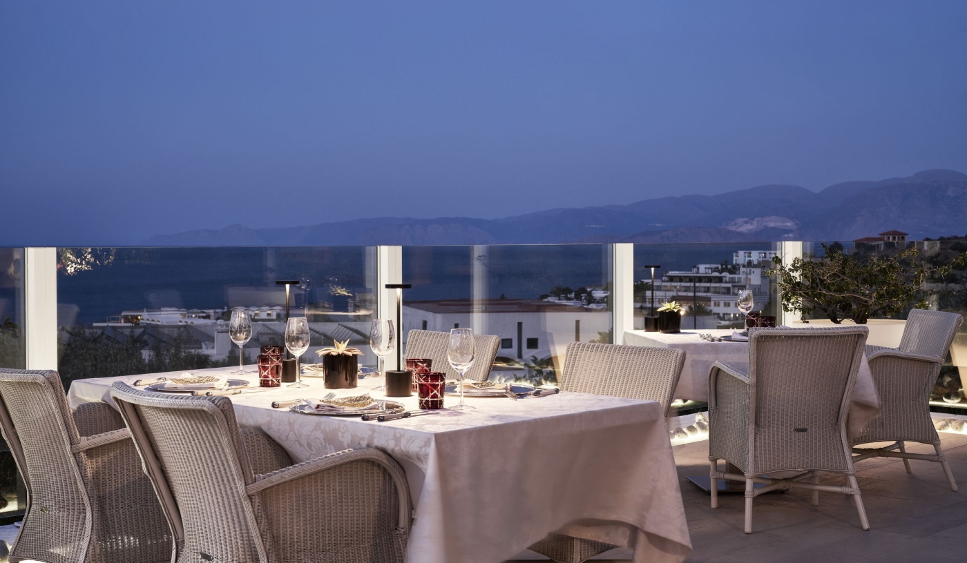 Dining focuses on well sourced Cretan produce and measured technique, best enjoyed on the terrace as light shifts across the bay