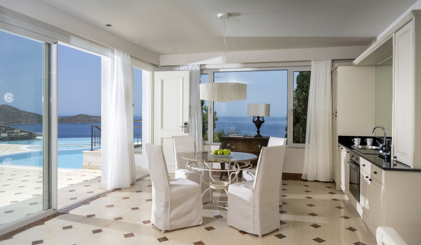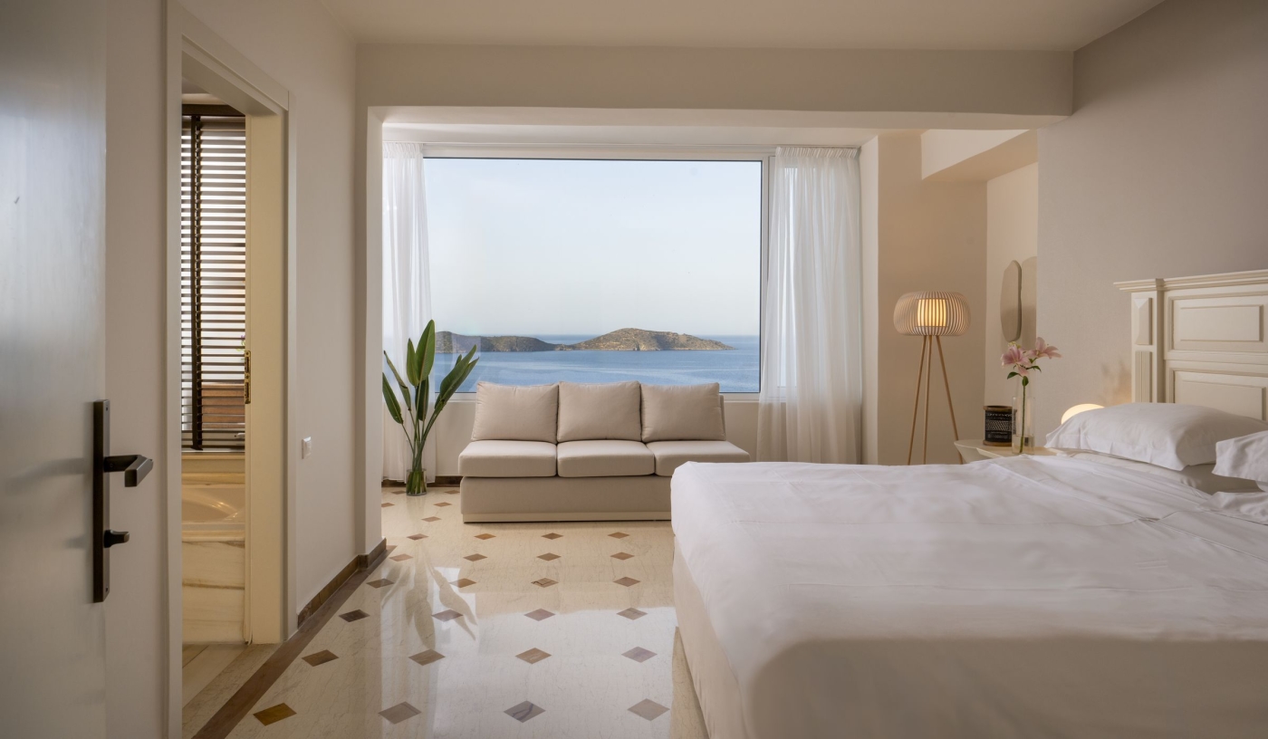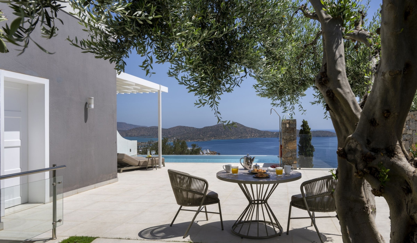 Set high above Mirabello Bay, the outlook is wide and unbroken, with the coast unfolding slowly below rather than pressing in around you