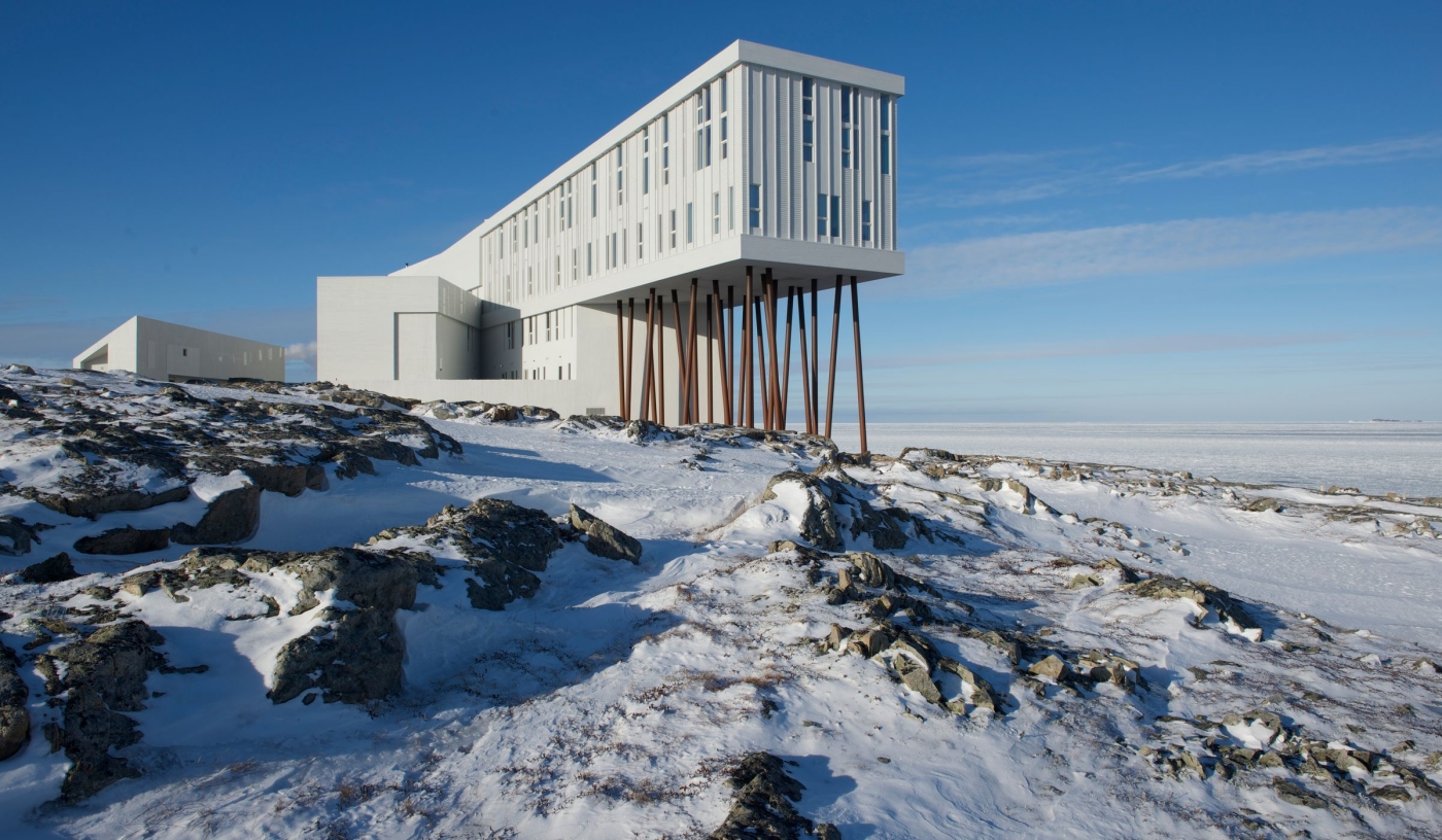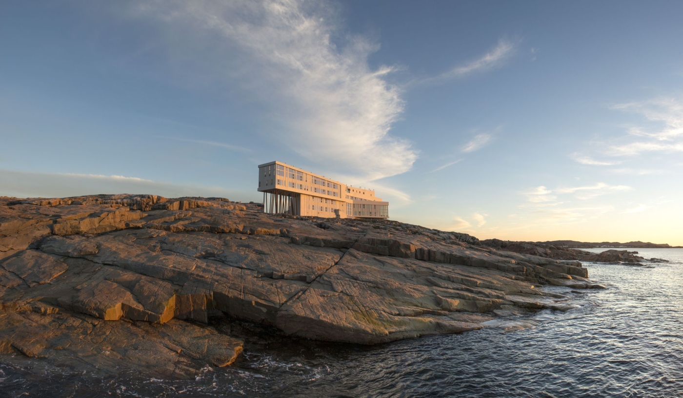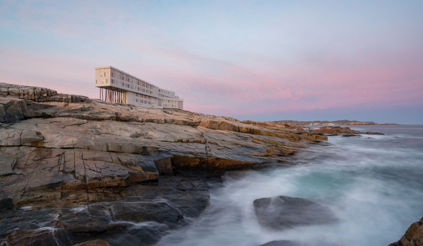 On Newfoundland’s rugged coast, where summer icebergs glide past and winter skies shimmer with the Northern Lights, Fogo Island Inn rises on stilts above the rocks. Its bold, angular form meets the elements head-on, yet inside the mood is calm, refined and quietly inviting.