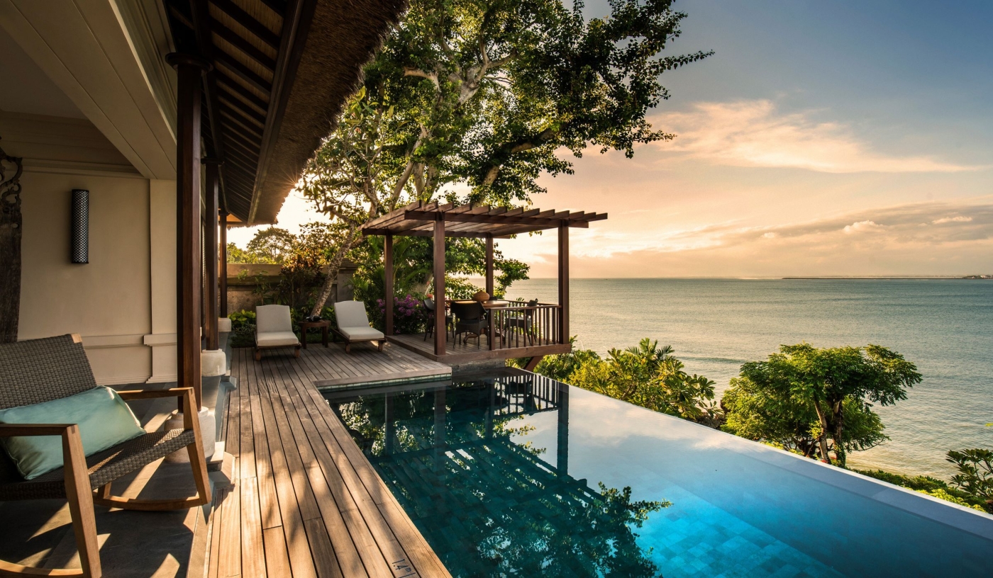 Overlooking the calm waters of Jimbaran Bay, with its glorious sunsets, The Four Seasons Resort Bali at Jimbaran Bay blends luxurious rooms and facilities with the style of a traditional Balinese village. Hidden amid fragrant gardens, it features thatched roofs, reflecting pools and its own original temple.