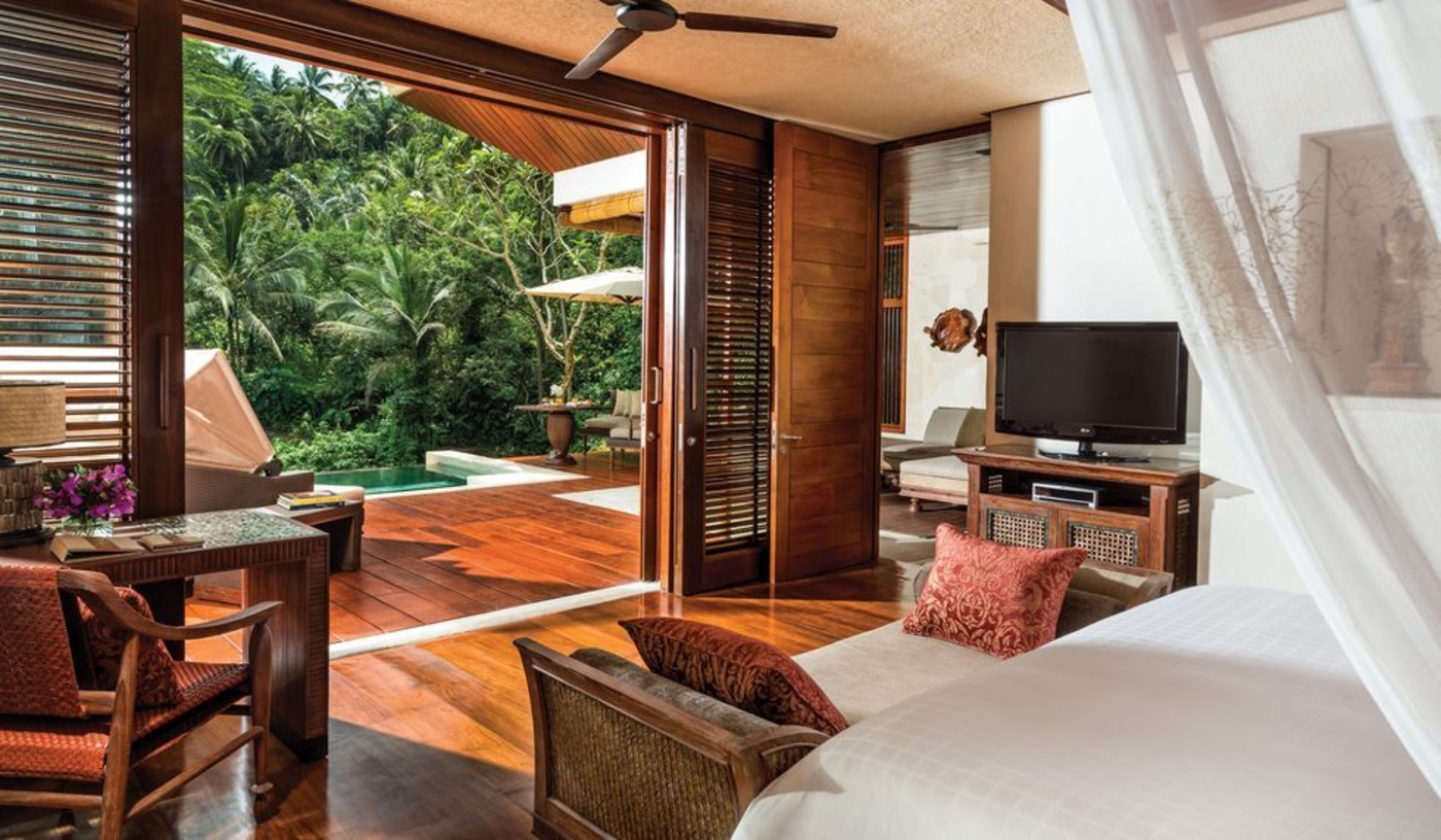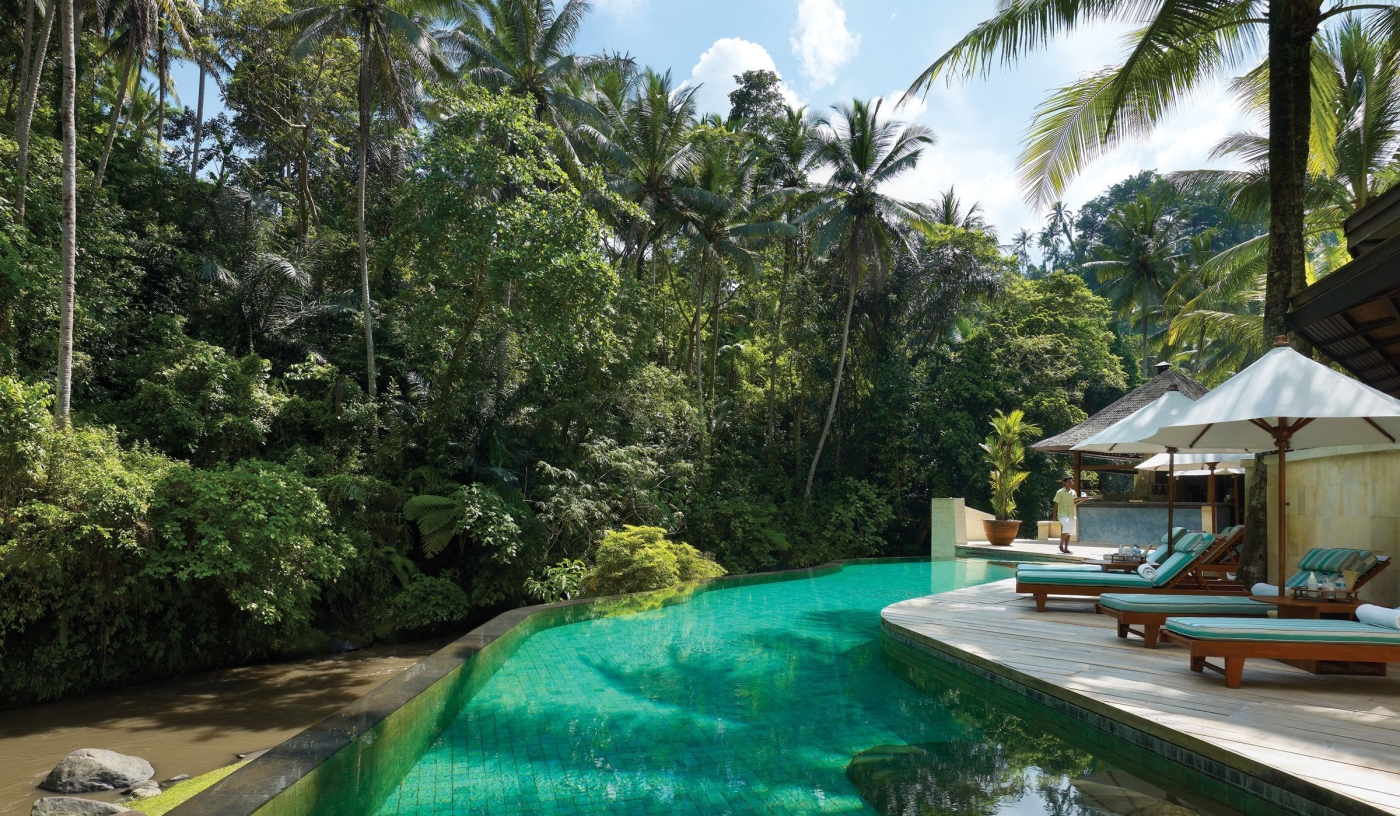 Stay in villas with private plunge pools, open-air bathrooms, and views of the lush jungle for an immersive Balinese experience