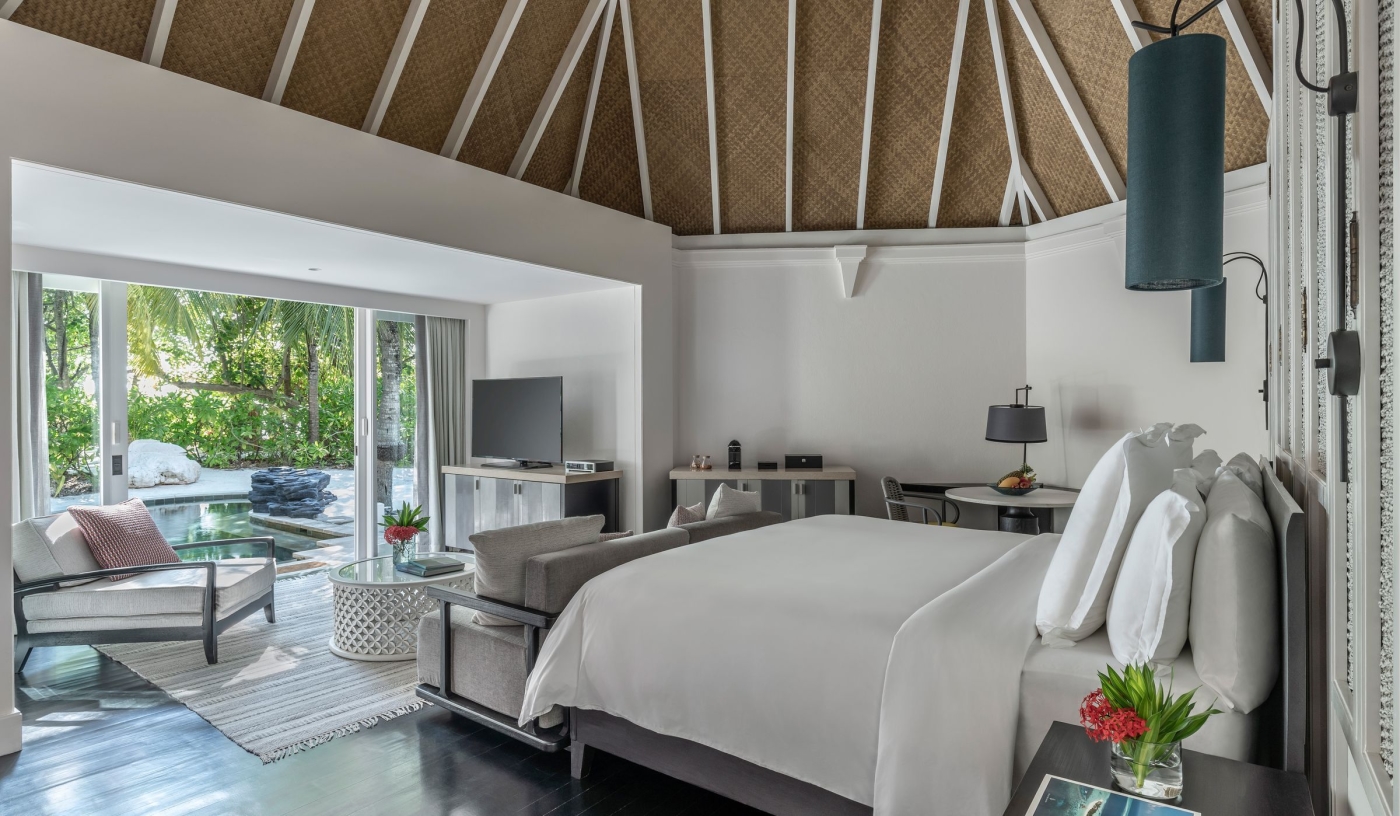 Thatched accommodations are all beautifully appointed, from romantic beach pavilions and overwater villas to three-bedroom suites with sunrise or sunset views
