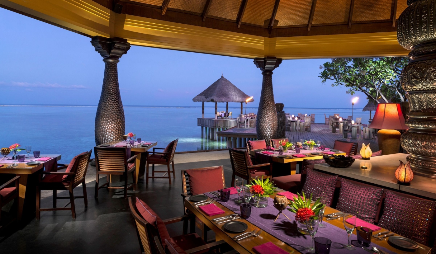 Culinary highlights include catch-of-the-day BBQs at Kandu Grill, stone-fired pizzas at the Italian Reef Club, and Indian fine-dining at award-winning Baraabaru