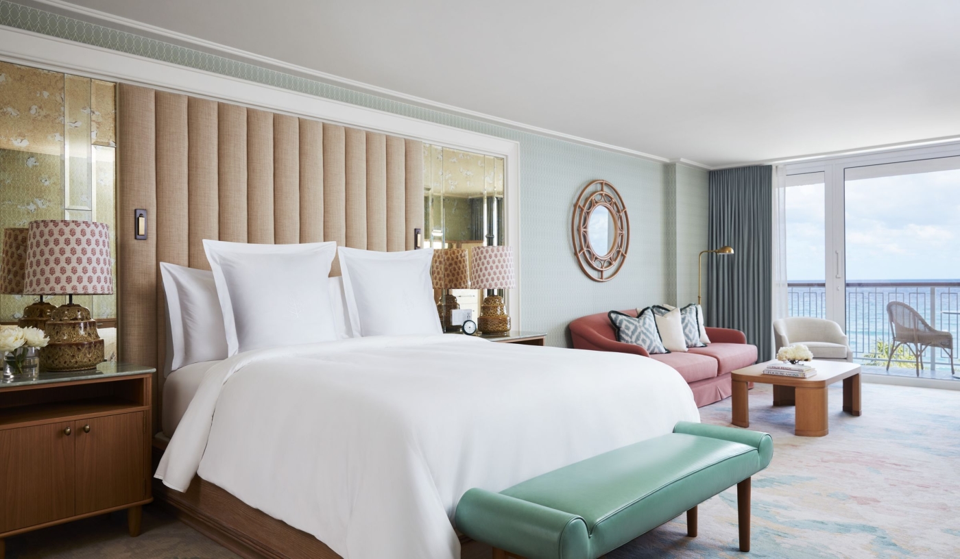 Rooms in soft cream and sand tones look onto the ocean, gardens or resort grounds, creating calm and quietly elegant spaces.