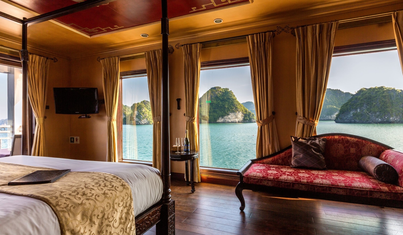 The youngest of 'Three Sisters', the Violet is an intimate vessel with just 6 elegant cabins. Violet offers passengers a uniquely exclusive opportunity to take in the sights of Halong Bay over one or two nights, observing as towering limestone islands dwarf the vessel as it navigates through this magical waterway. Reminiscent of a traditional Asian junk, floor-to-ceiling windows frame the spectacular view, while guest amenities include a scenic spa, restaurant and lounge plus a rooftop sundeck.