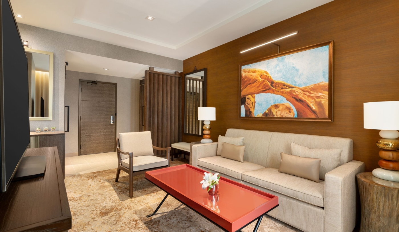 Many rooms overlook the red rock scenery, while suites add living space and balconies for wide desert views.