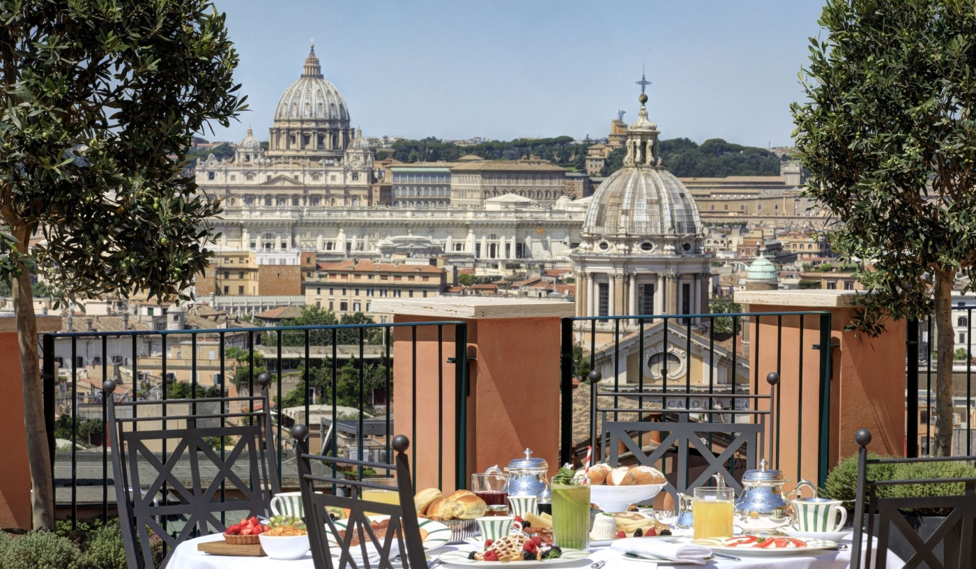 Set above the Spanish Steps, the rooftop bar and terrace offer jaw-dropping views over Rome’s rooftops, perfect for sunset spritzes or starlit soirées.