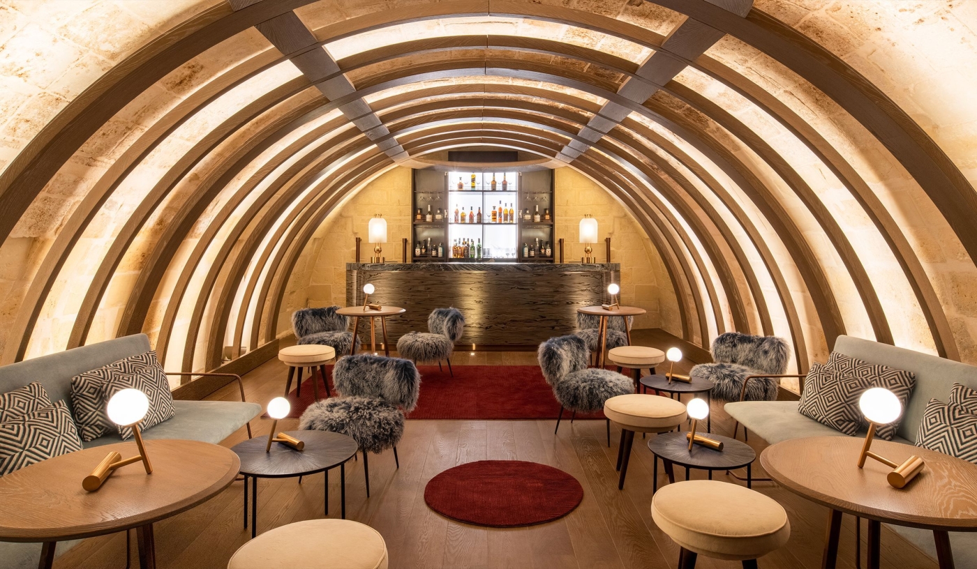 The guest-only lounge bar serves drinks round the clock and hosts wine tastings and artist-led events in centuries-old stone vaults.