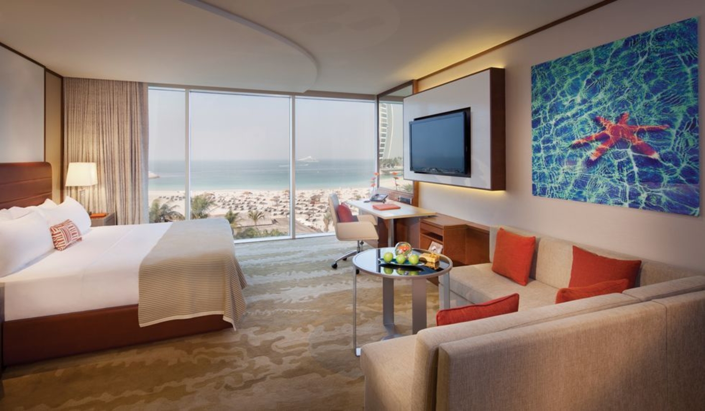 The 26-storey hotel, in the shape of a breaking wave, is cleverly designed so all rooms are sea facing with views of the sail-shaped Jumeirah Burj Al Arab