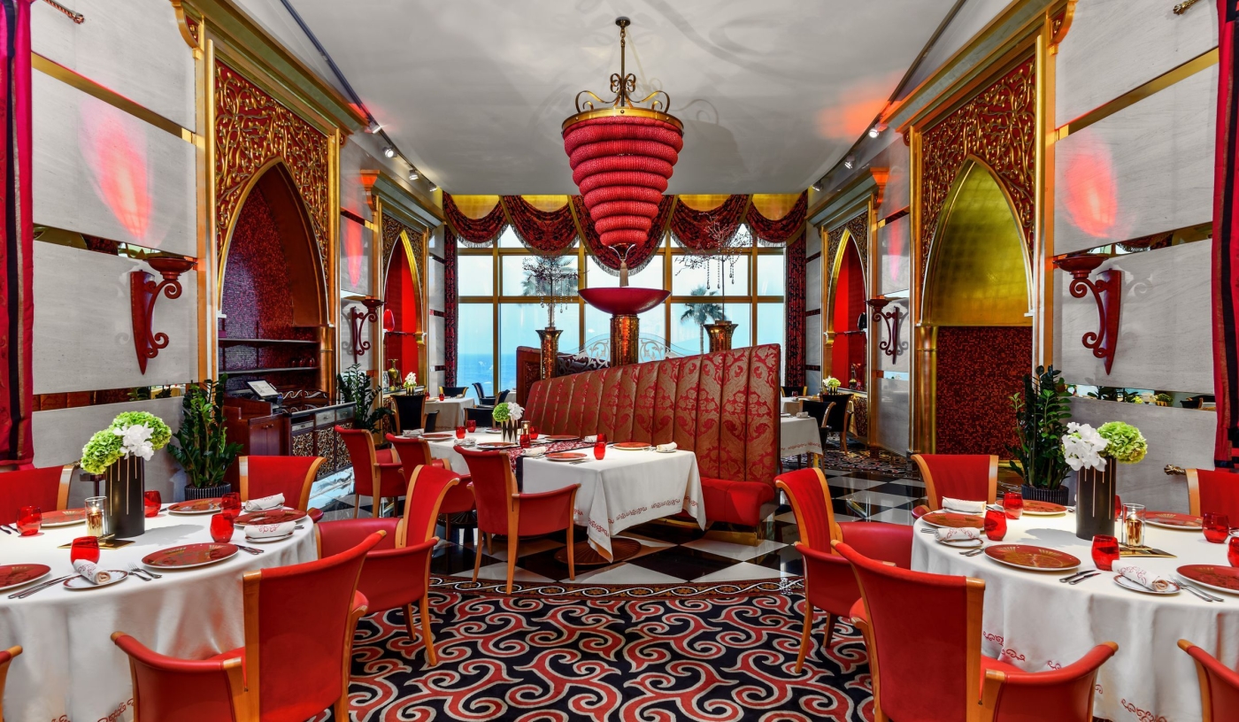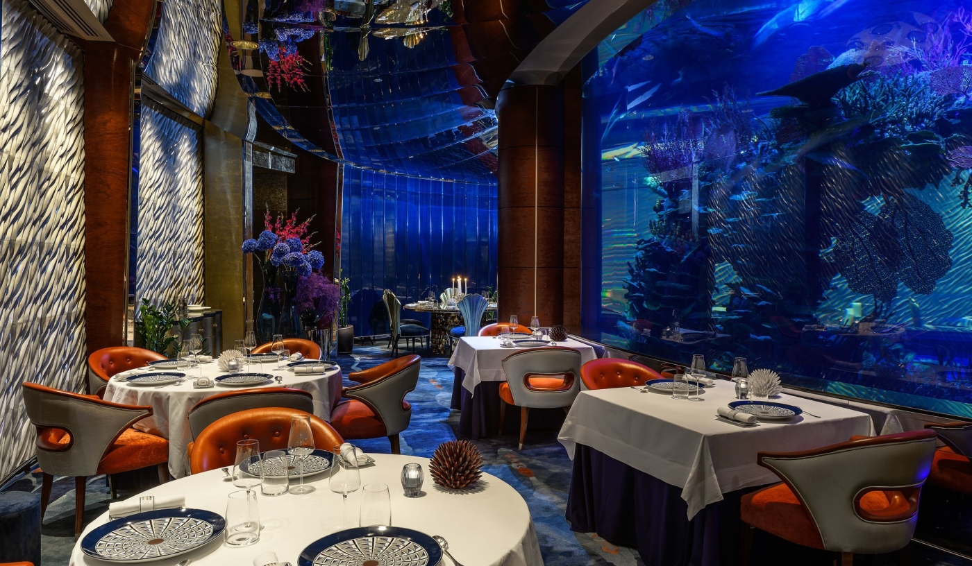 Dining spans classic and contemporary, from afternoon tea under the atrium to seafood served above the water at Al Mahara.