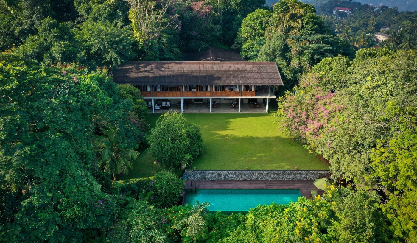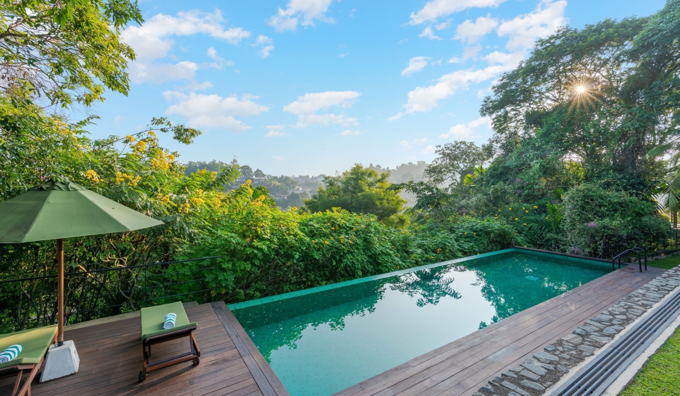 The hotel’s hillside position keeps it close to Kandy yet sheltered by forest, with views across the surrounding highlands