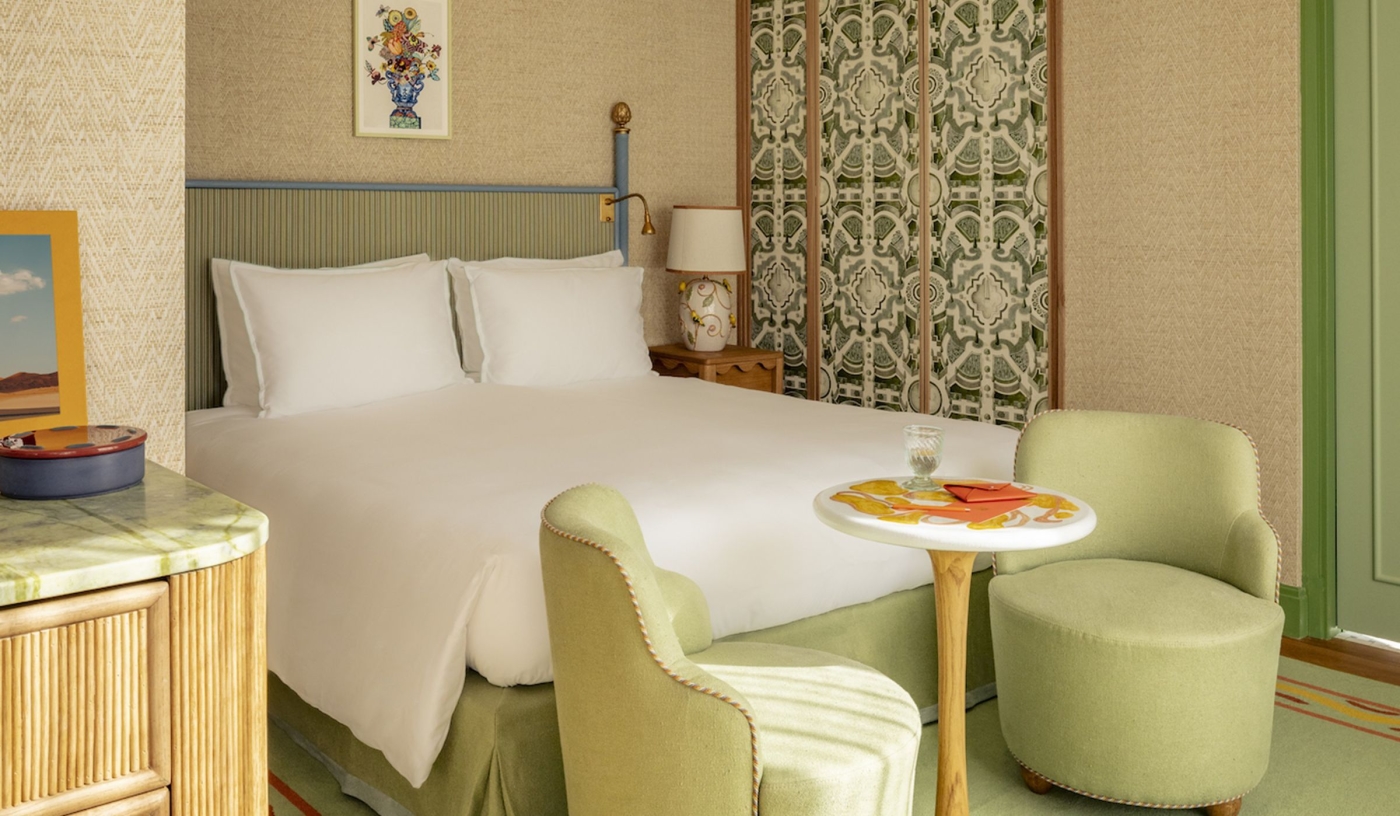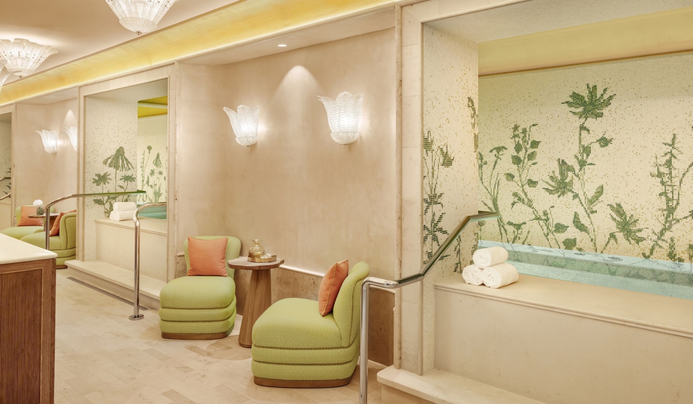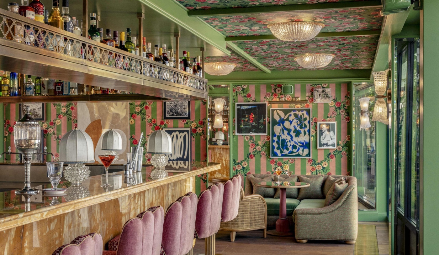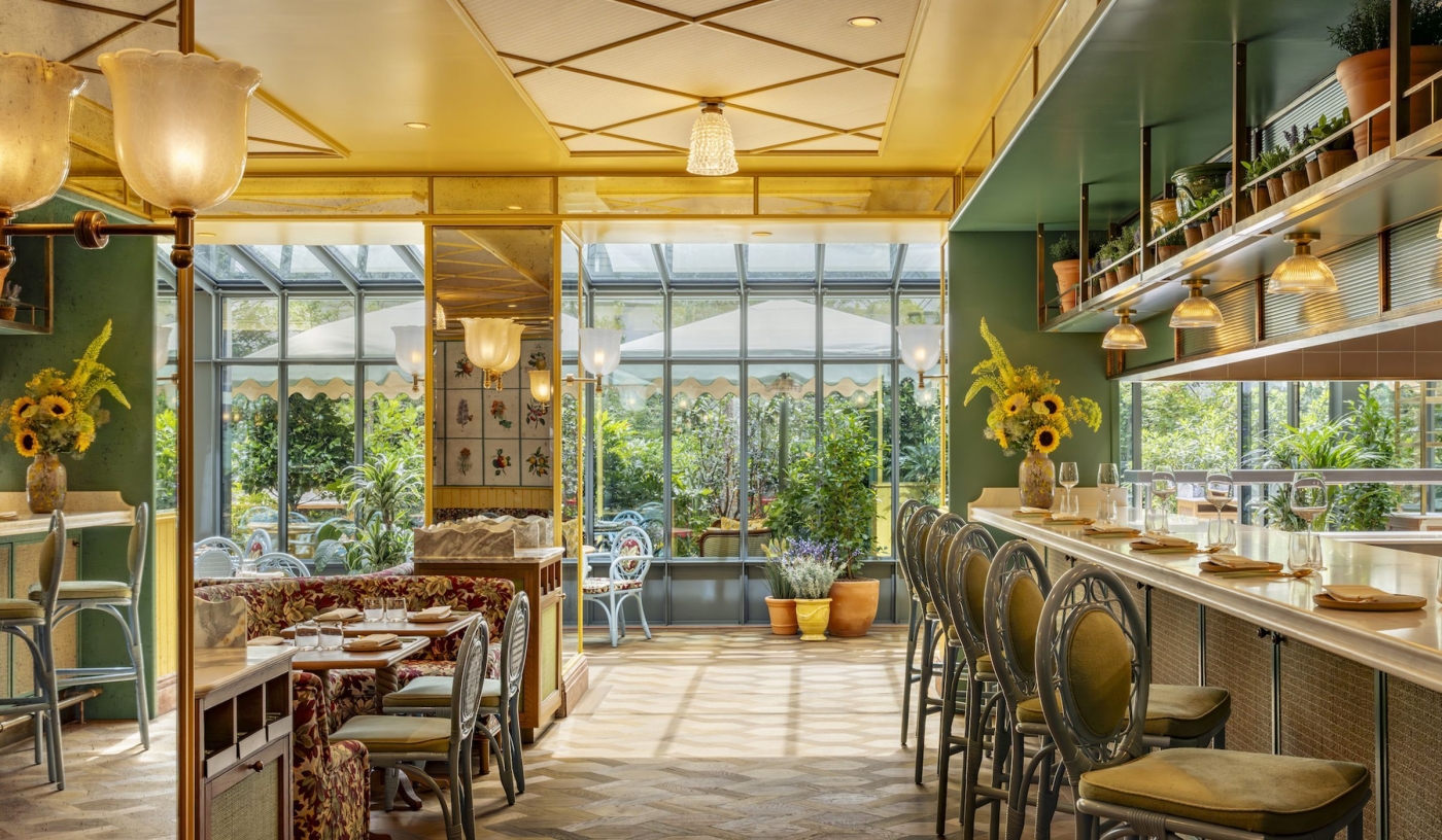 Interiors by Martin Brudnizki bring playful elegance: sunshine hues, floral banquettes and tree-lined dining.