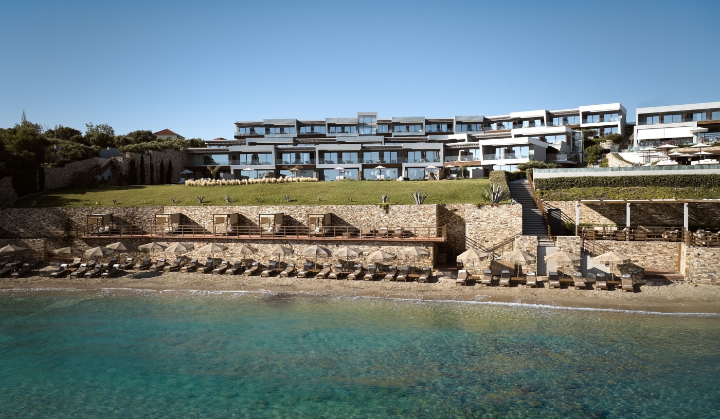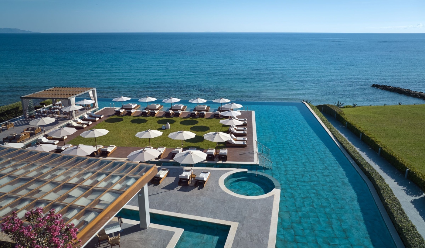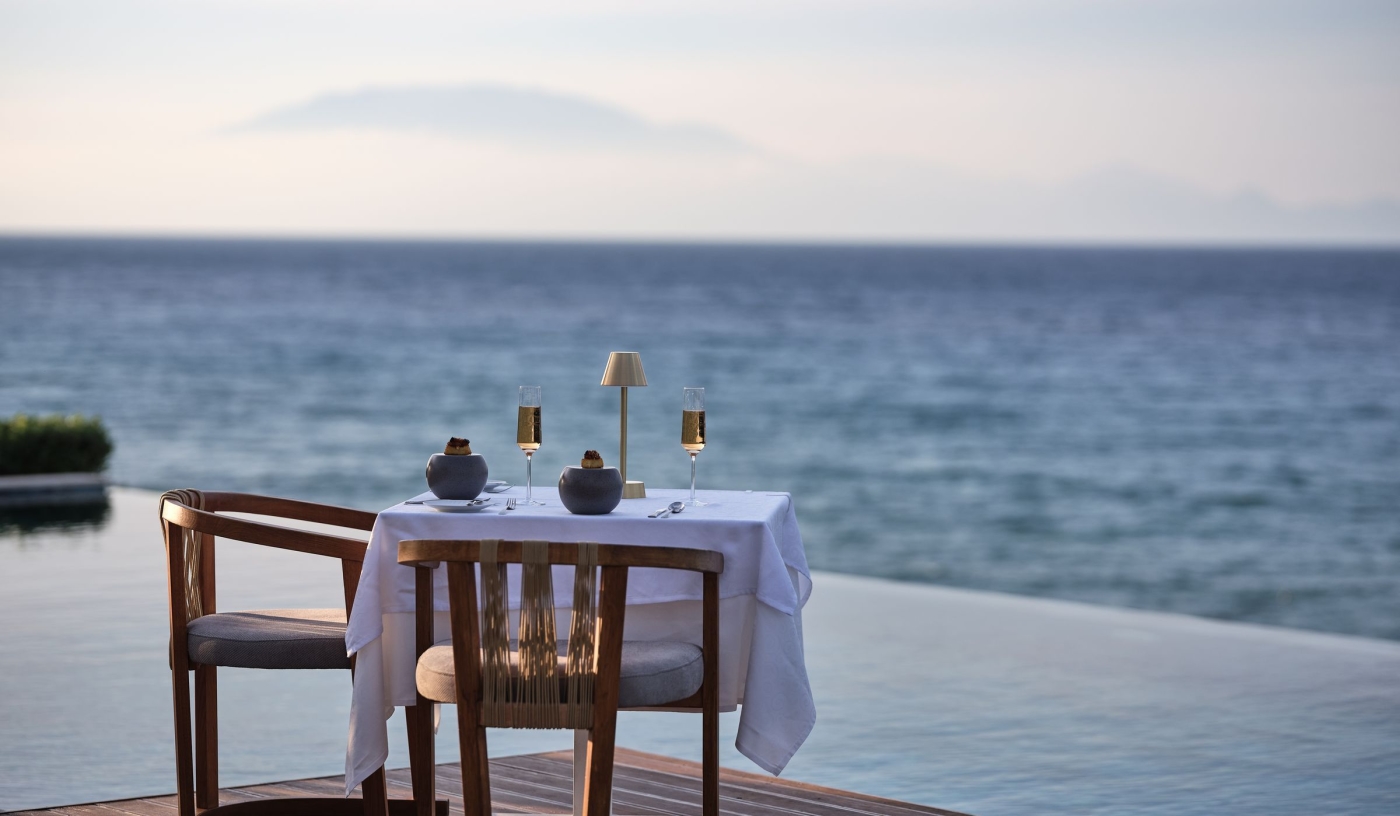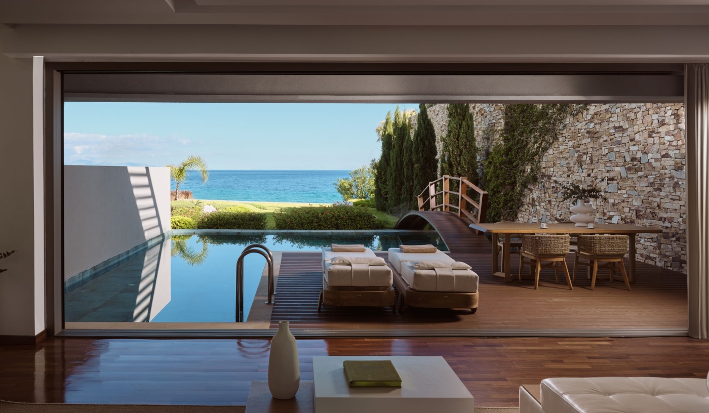 All six suite categories look out over the Ionian Sea, with most offering a private pool or outdoor hot tub.
