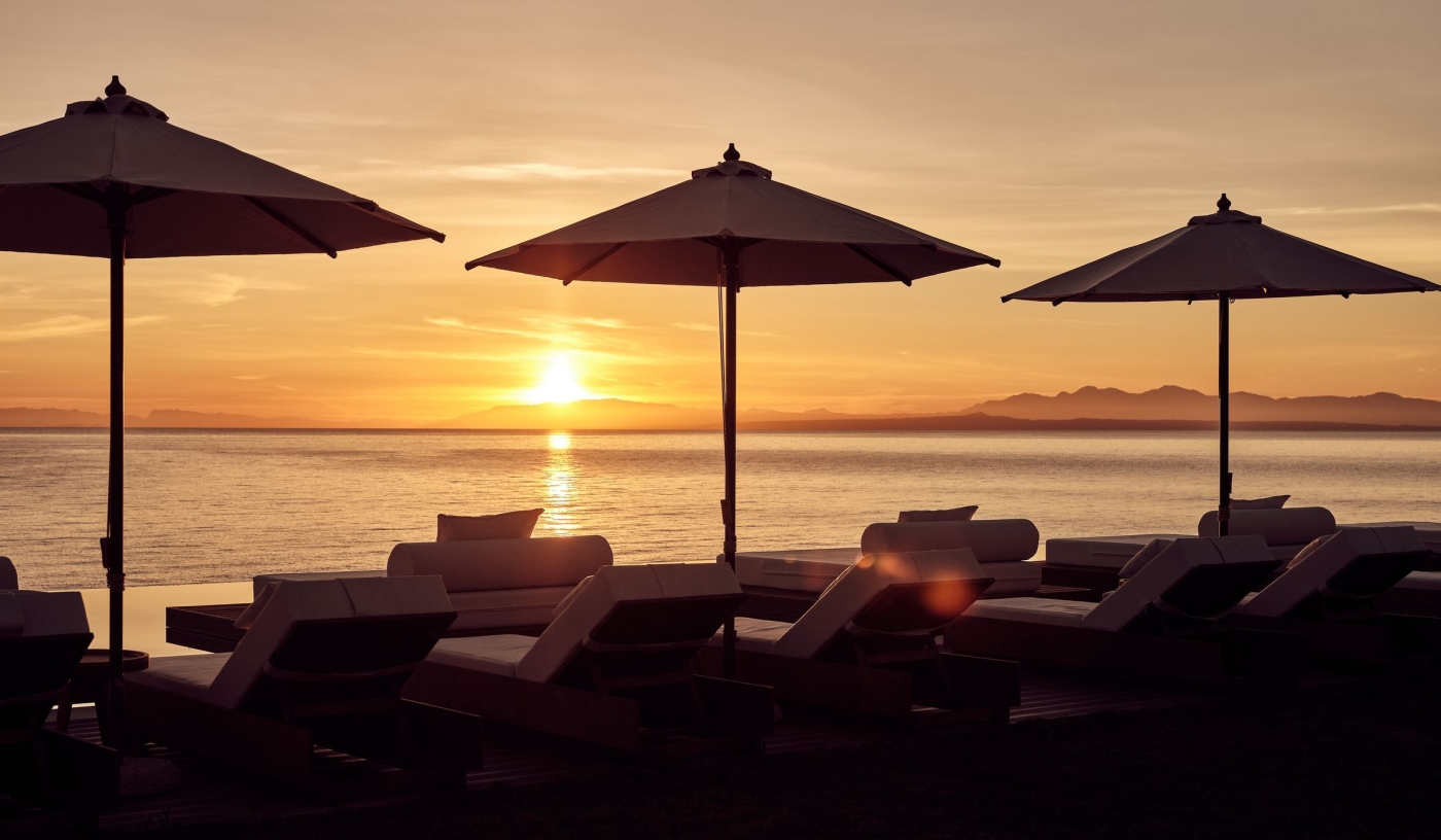 The vast infinity pool meets neatly kept lawns that lead down to a small beach, sundeck and jetty.