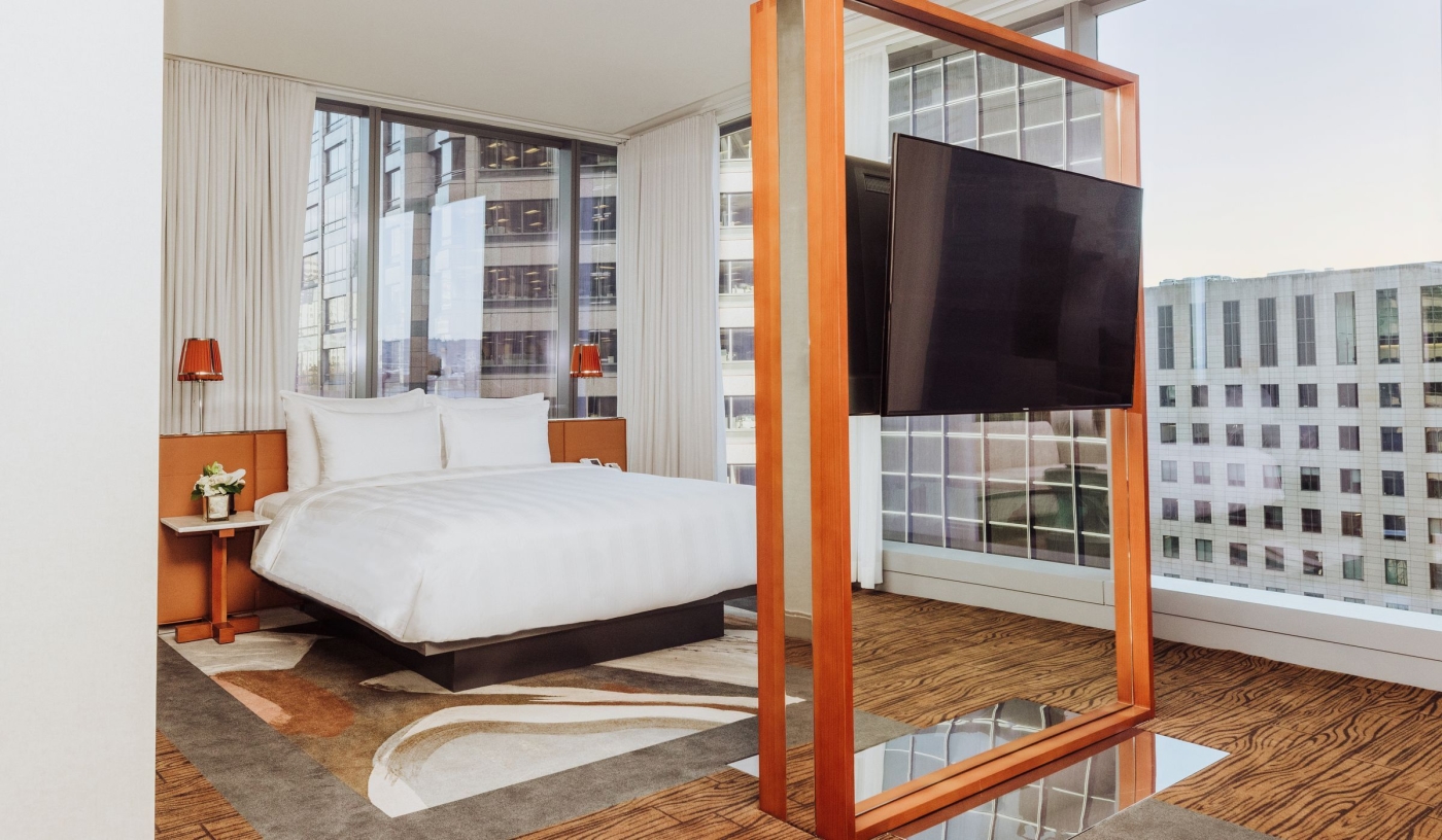 Rising above Downtown, the hotel’s guest rooms look out over Elliott Bay through expansive windows