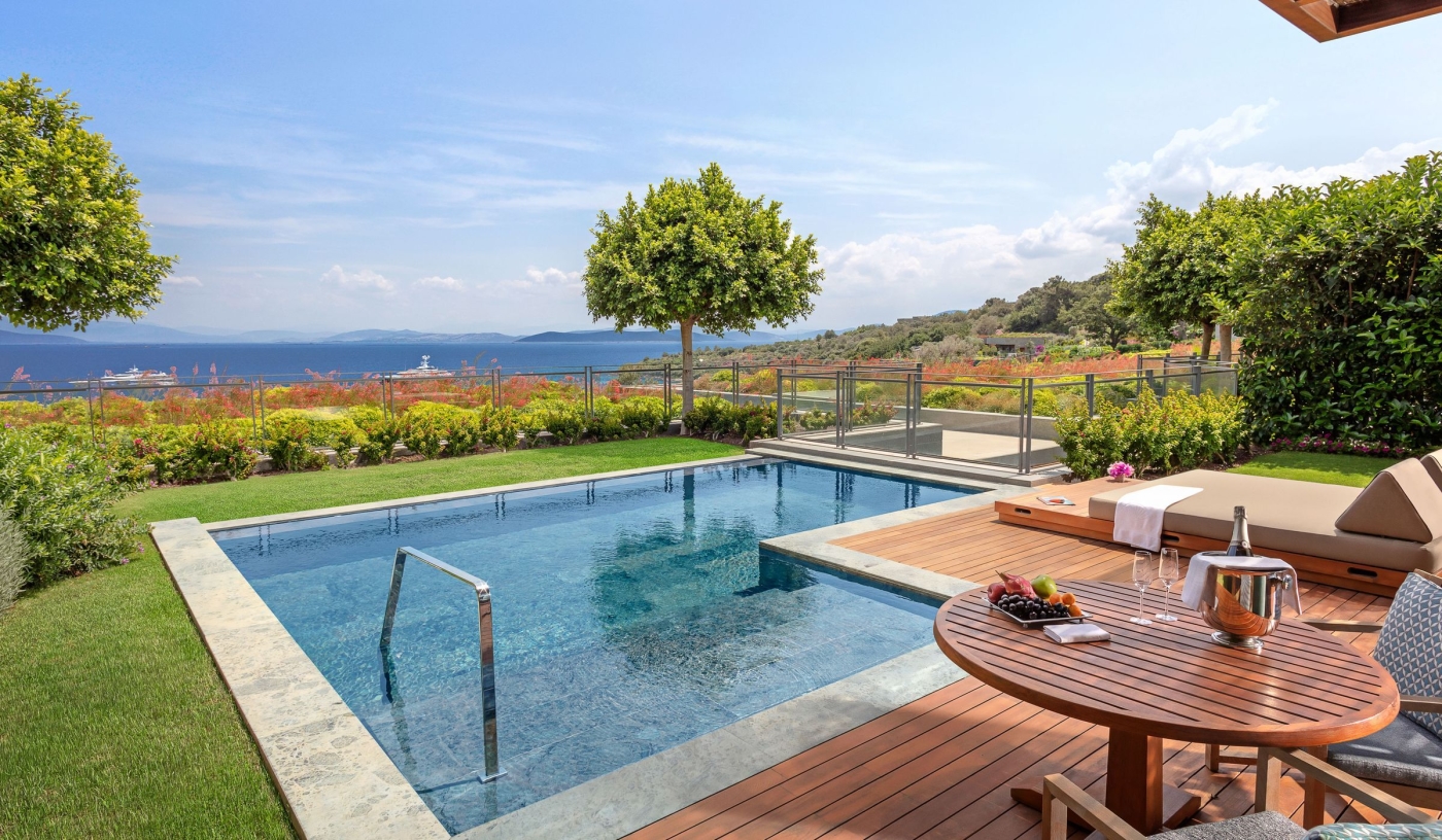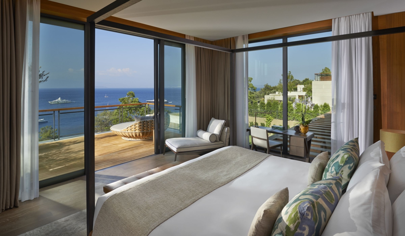 Sea-facing rooms, suites and villas cascade down the hillside, some with private pools and all finished with refined Turkish and Oriental design.