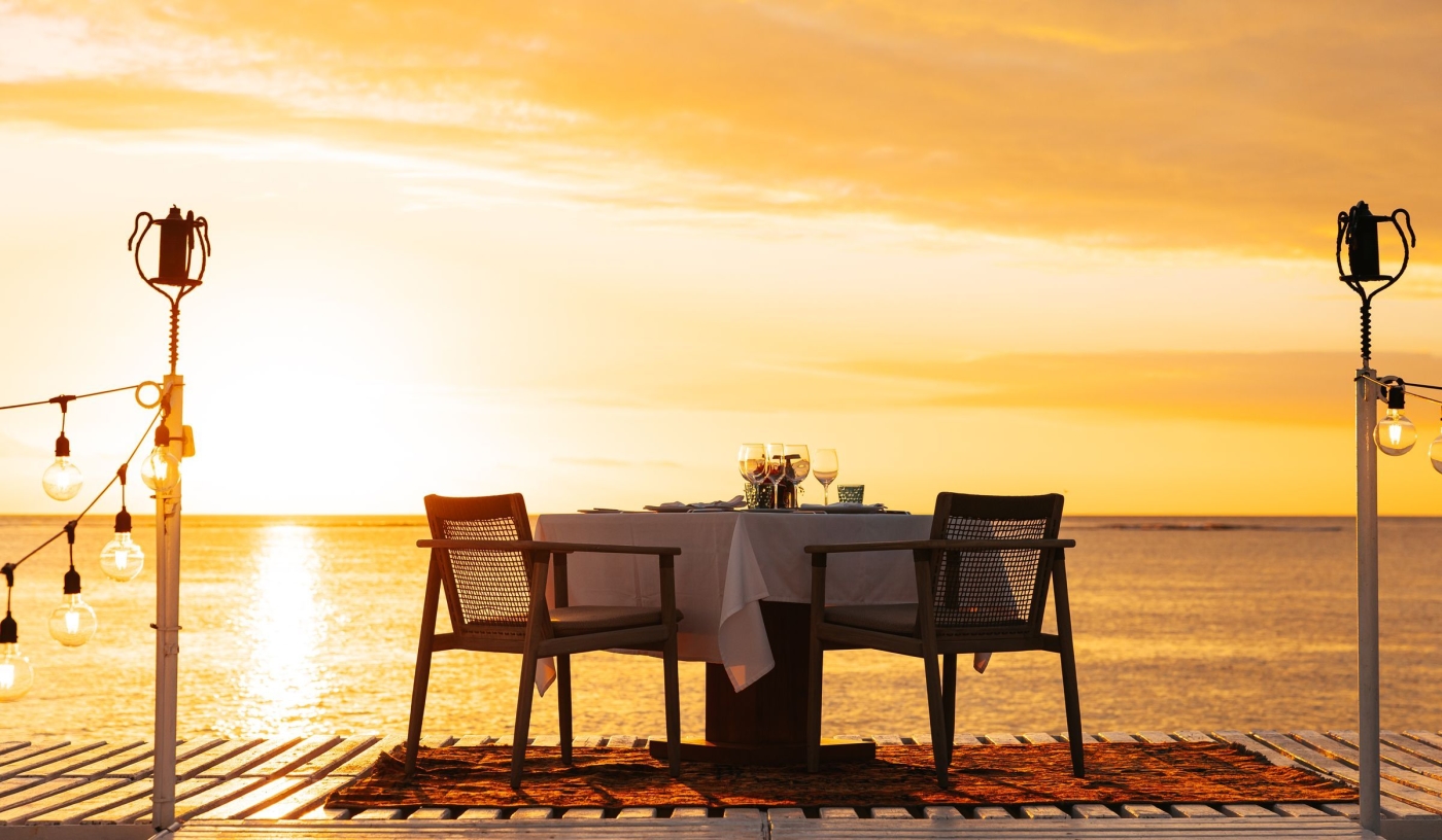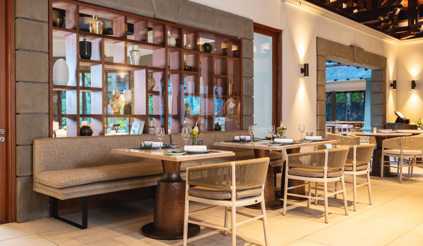 Dining options include in-villa service, a signature menu crafted by Michelin-starred chef Yannick Hochet at Cassine, a Washoku menu designed by a Japanese culinary consultant at Haiku, Indian fine dining at Cilantro, plus fresh seafood at the Beach House Grill