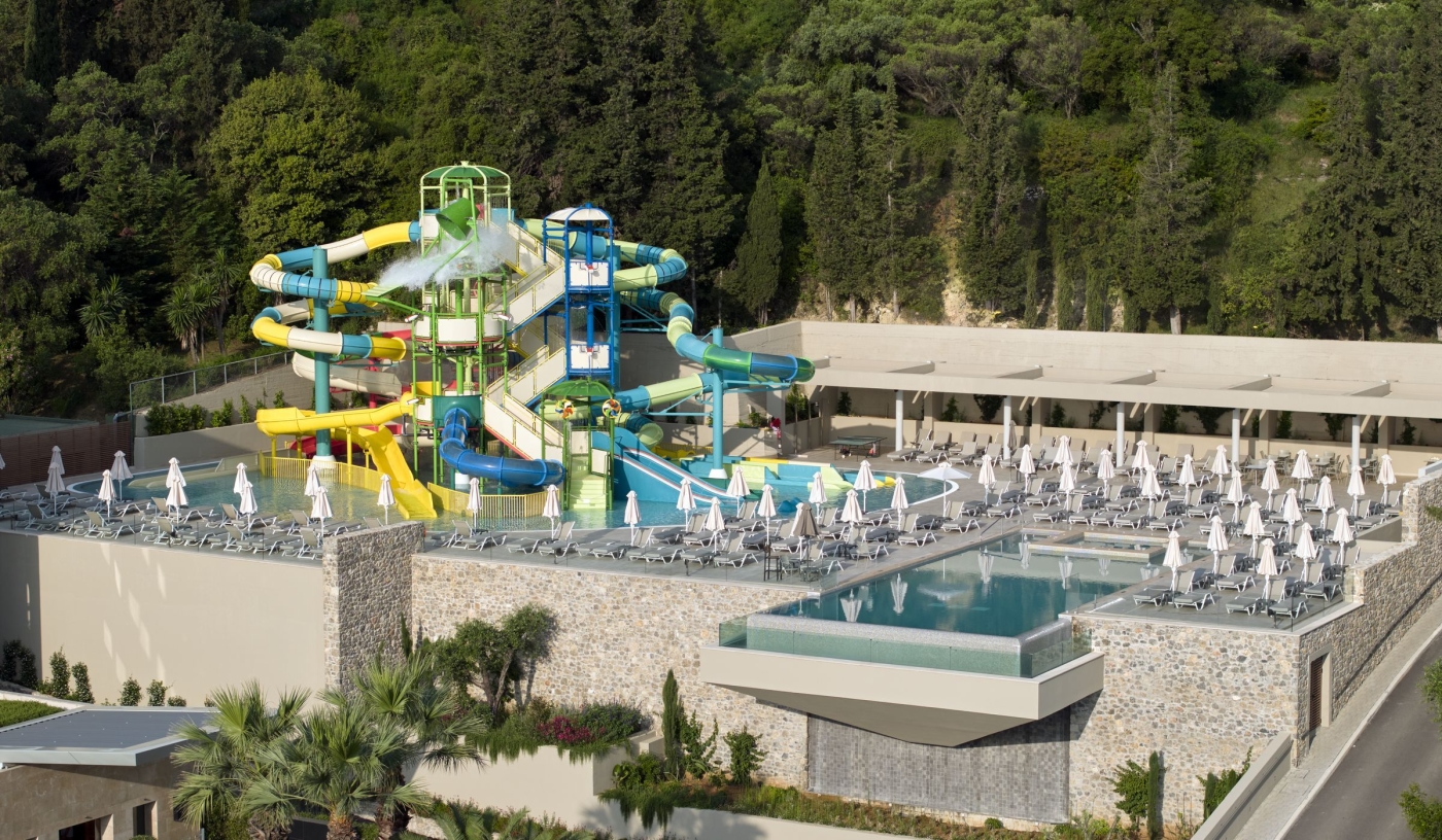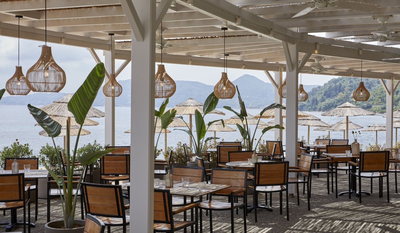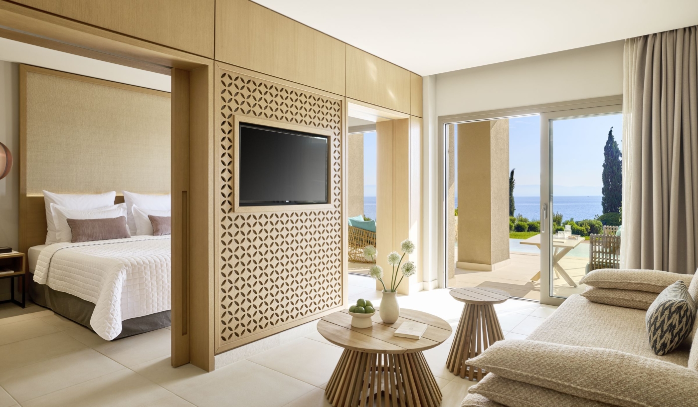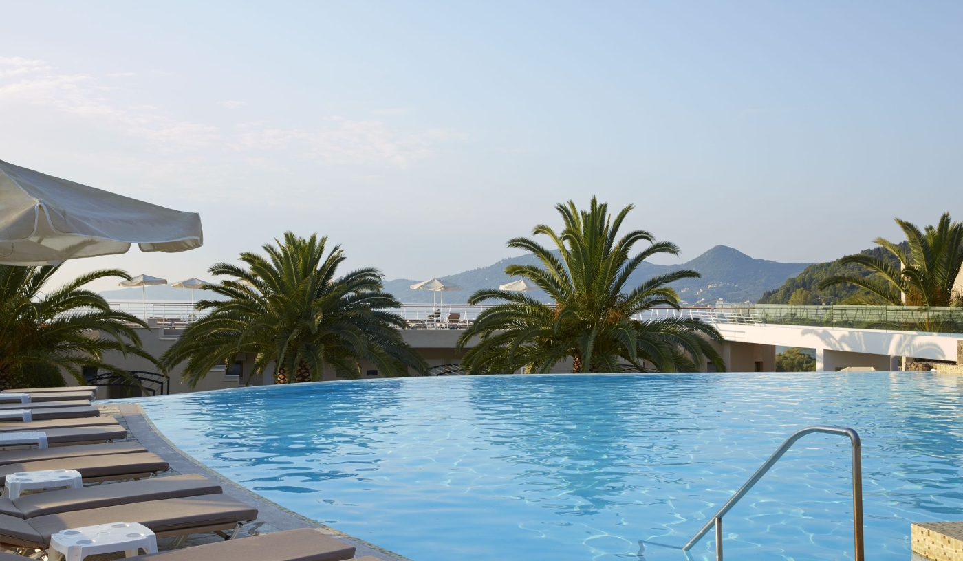 Set on an idyllic, lush green hilltop overlooking picturesque Benitses Bay, with seemingly endless sea views, it’s hard not to be impressed by the elevated style and contemporary heights of this lavish spa and beach resort.