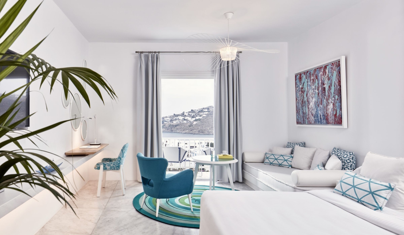 A tiered vision of white and blue, this crisp and contemporary hotel is romantic and relaxed. Occupying an elevated position, just uphill from the beach, and overlooking the Aegean Sea and the sacred island of Delos, there’s truly no better place to take in Mykonos’s stunning sunsets.