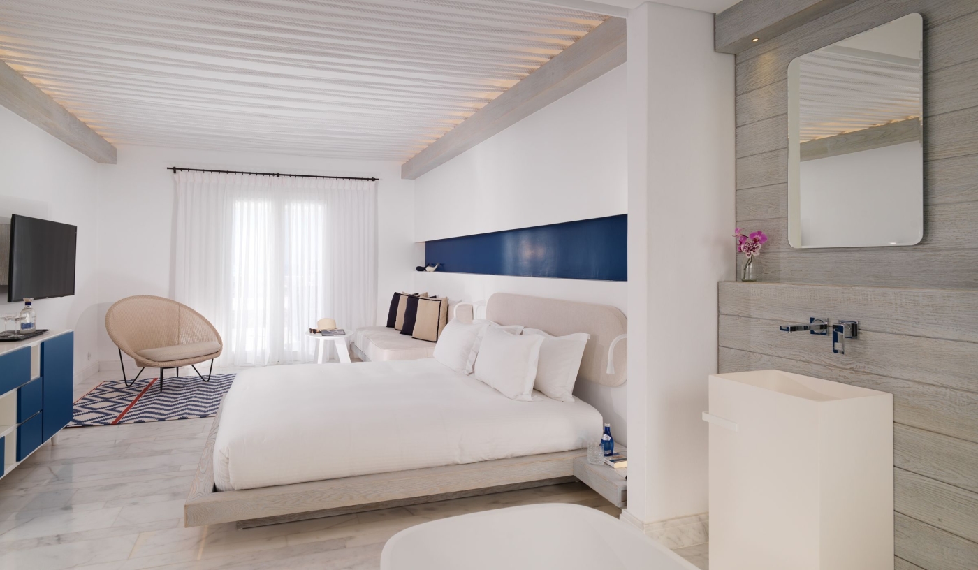 A tiered vision of white and blue, this crisp and contemporary hotel is romantic and relaxed. Occupying an elevated position, just uphill from the beach, and overlooking the Aegean Sea and the sacred island of Delos, there’s truly no better place to take in Mykonos’s stunning sunsets.