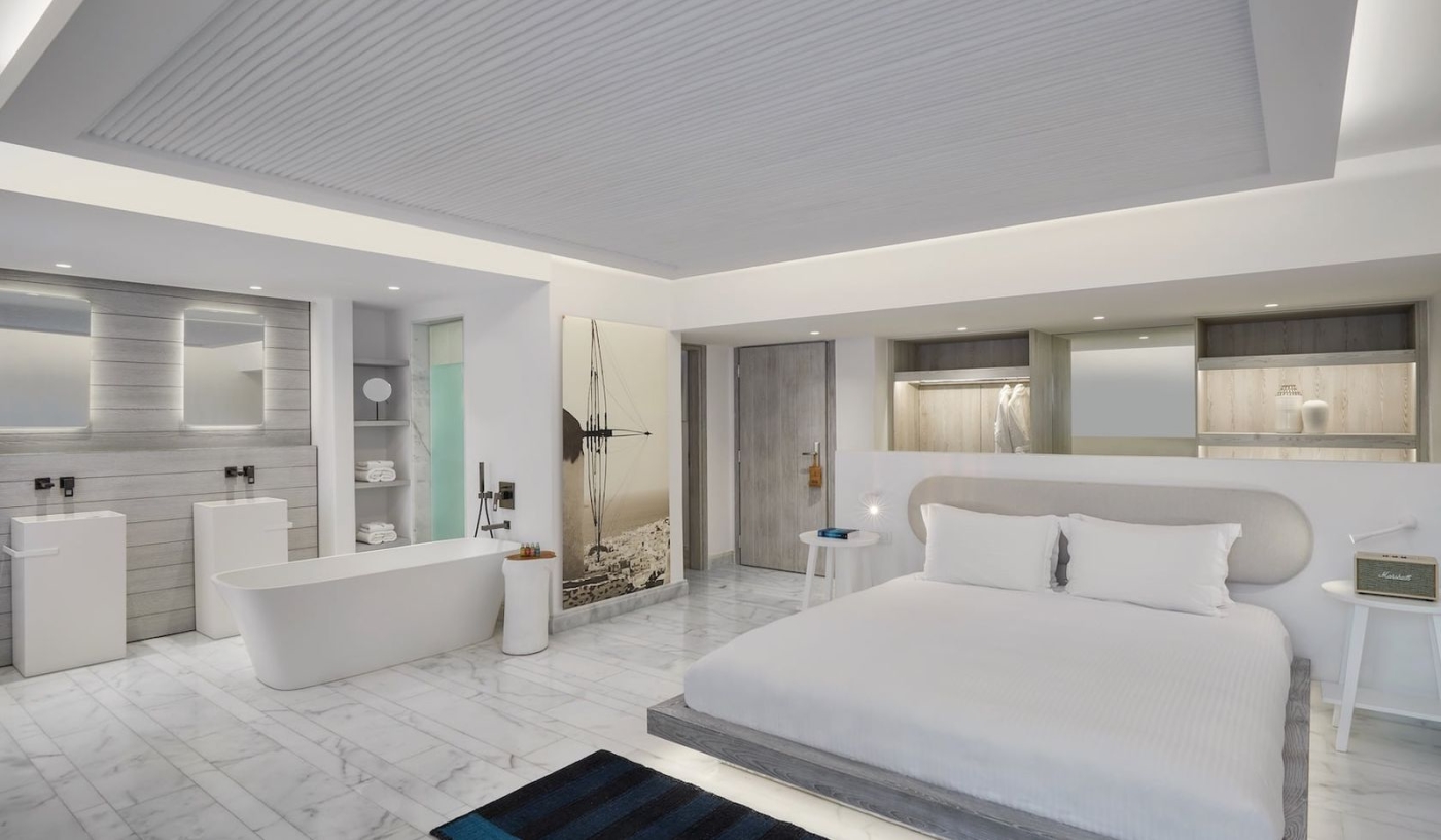 Drift between the sleek infinity pool, luxe spa and hammam, or catch a ride to Agios Stefanos beach in the hotel’s complimentary shuttle.