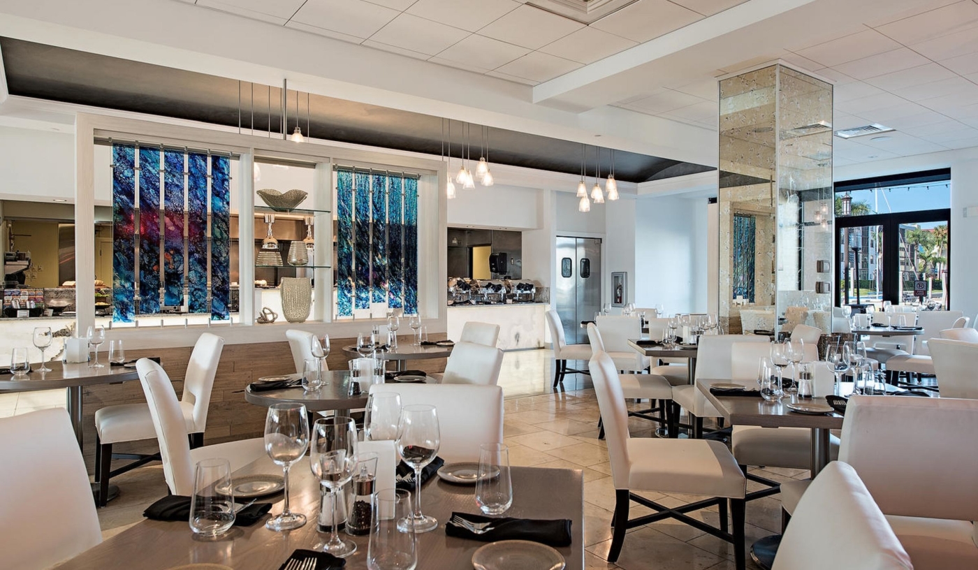 Dining includes casual waterside options as well as refined Italian menus served in the evening.