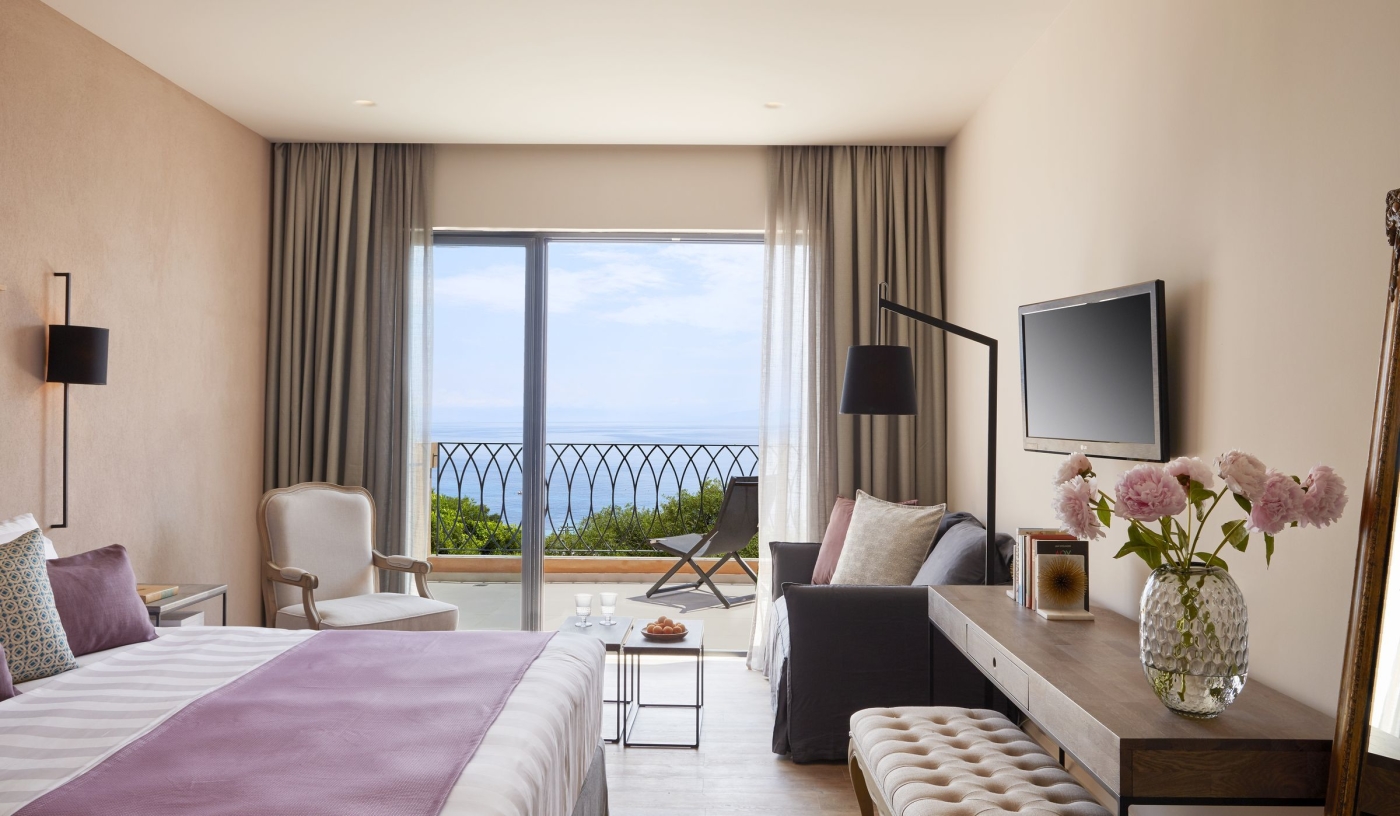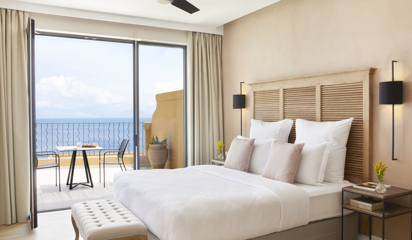 Deluxe Junior Suites position the bed towards the horizon, so mornings begin with uninterrupted blue vistas.