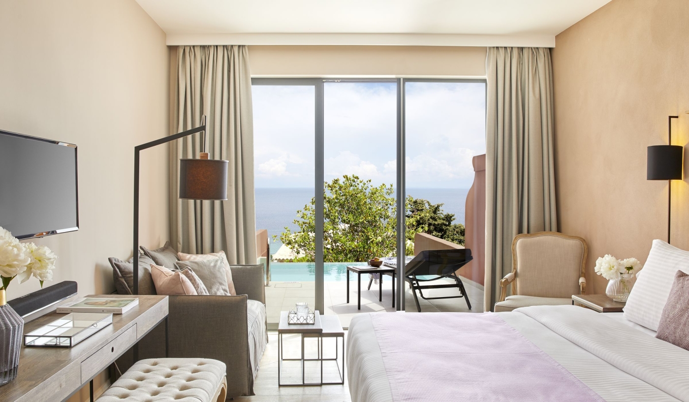 Contemporary suites are spacious and refined, many with private pools, verandas and panoramic sea views.