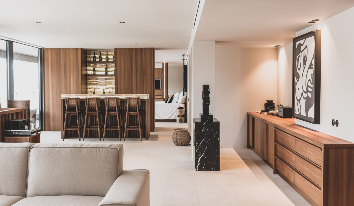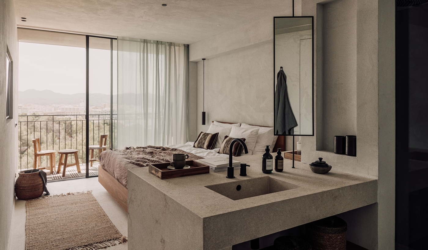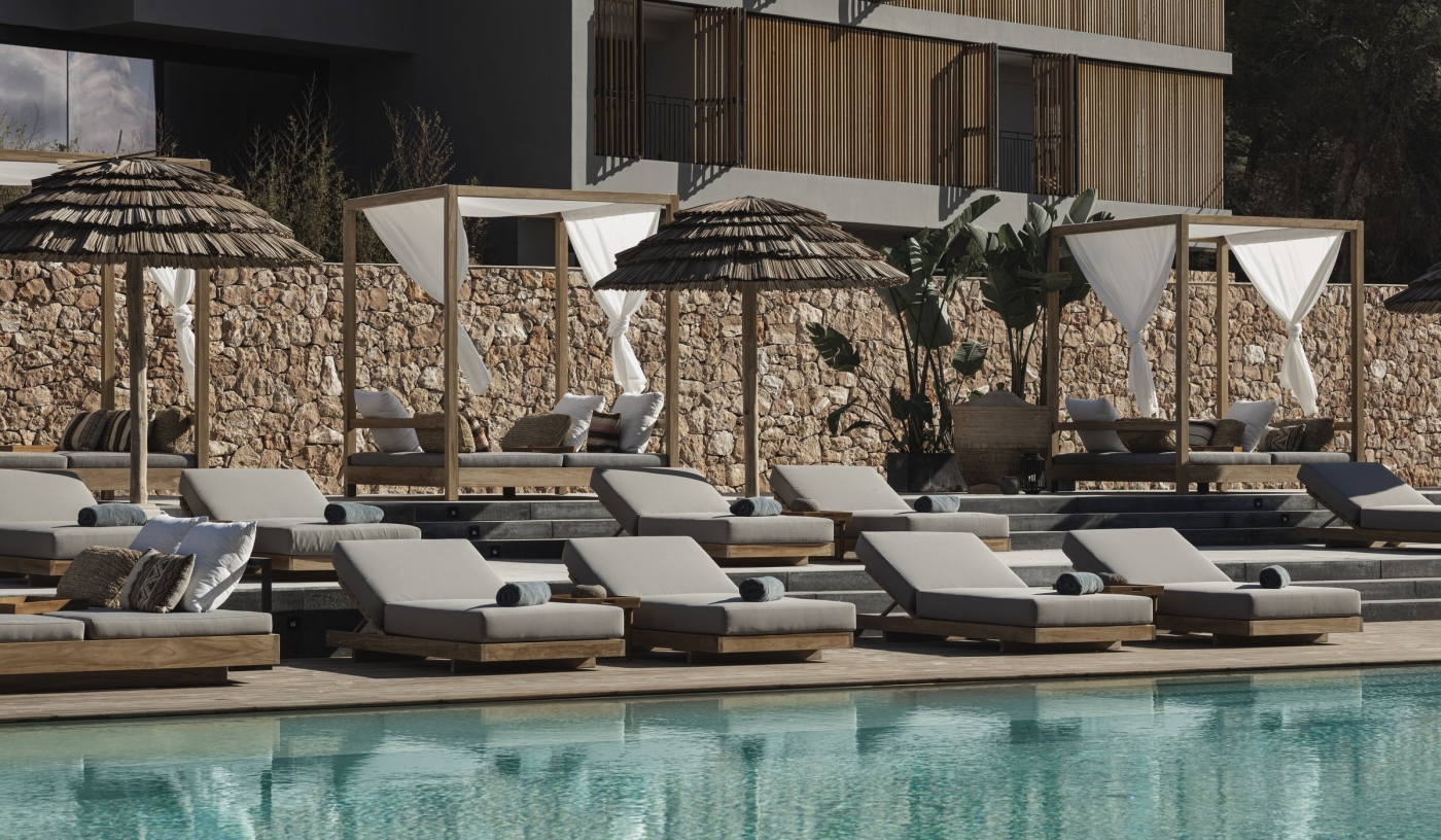 This boho-chic hideaway has shunned the usual all-white Ibiza palette in favour of natural dark woods, poured polished concrete and hand-crafted furniture from Papua New Guinea. It’s a fashionable look that attracts a young, global crowd, who when not lounging around the pool – one of the largest in Ibiza – are happy to take advantage of complimentary morning yoga, personal training sessions, and quick and easy access to San Antonio and the sunset strip.