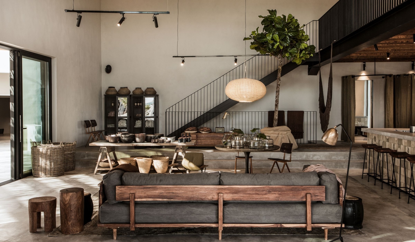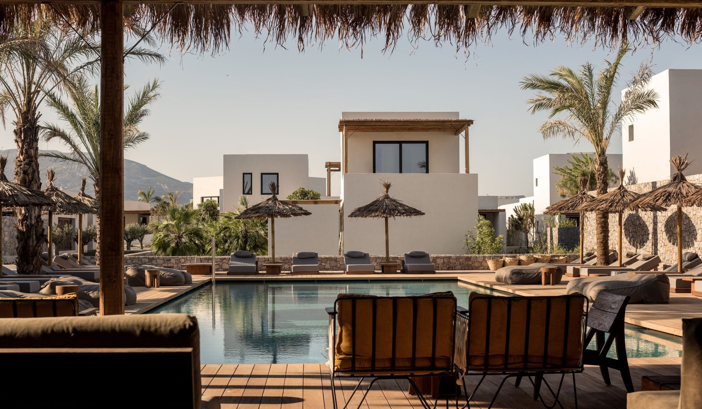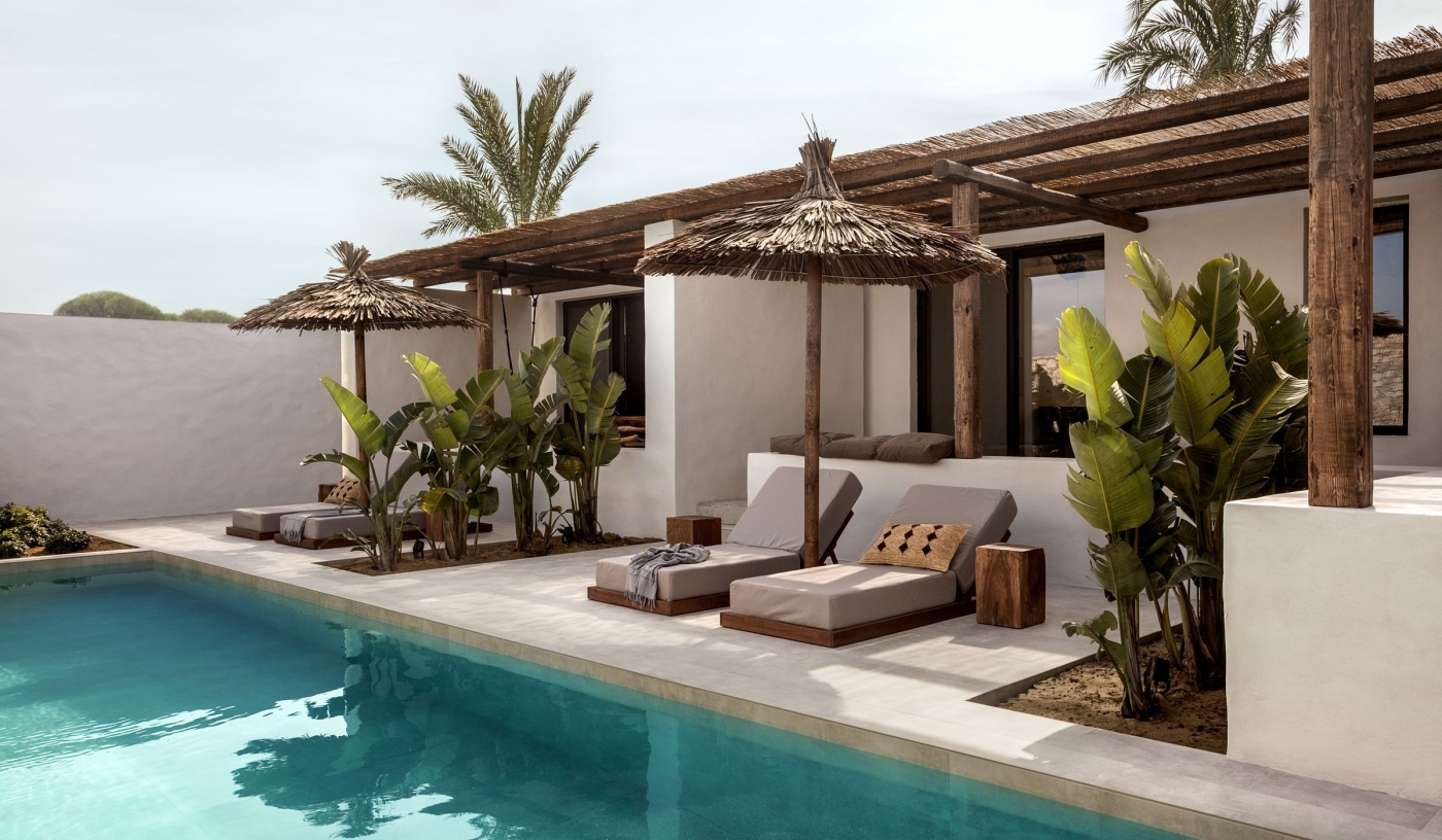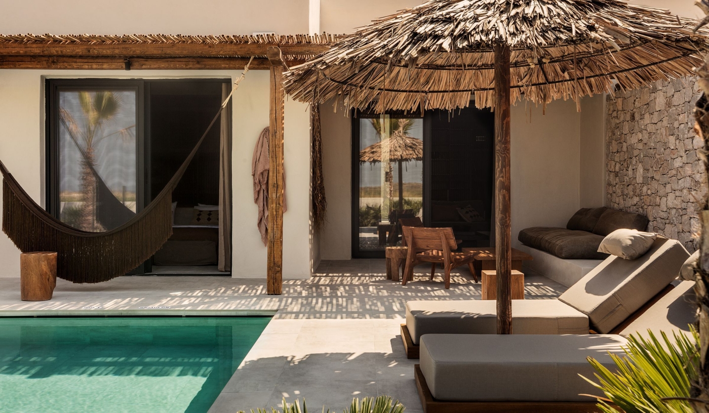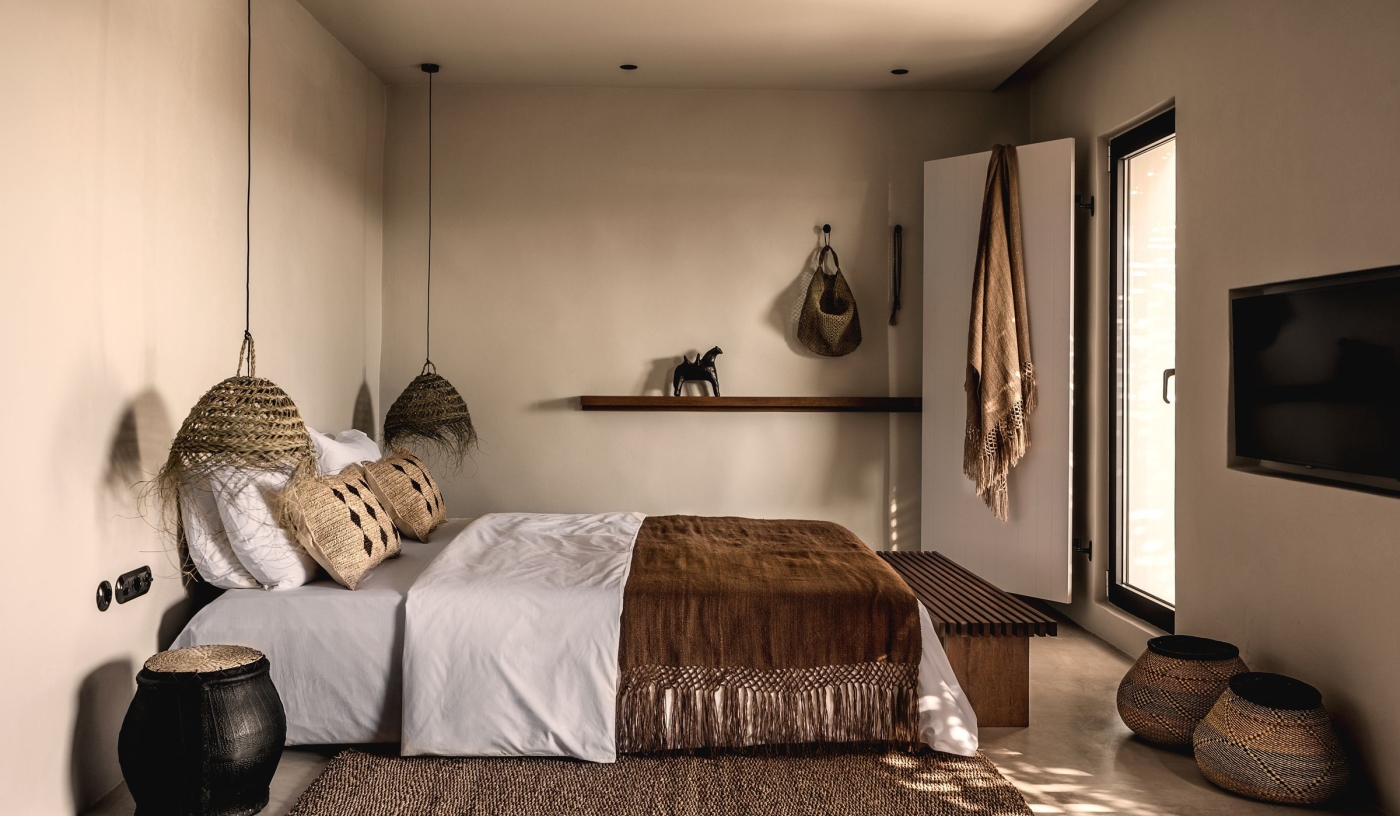 Rooms and suites use natural textures and handmade pieces; some offer roof terraces, private pools or shared gardens